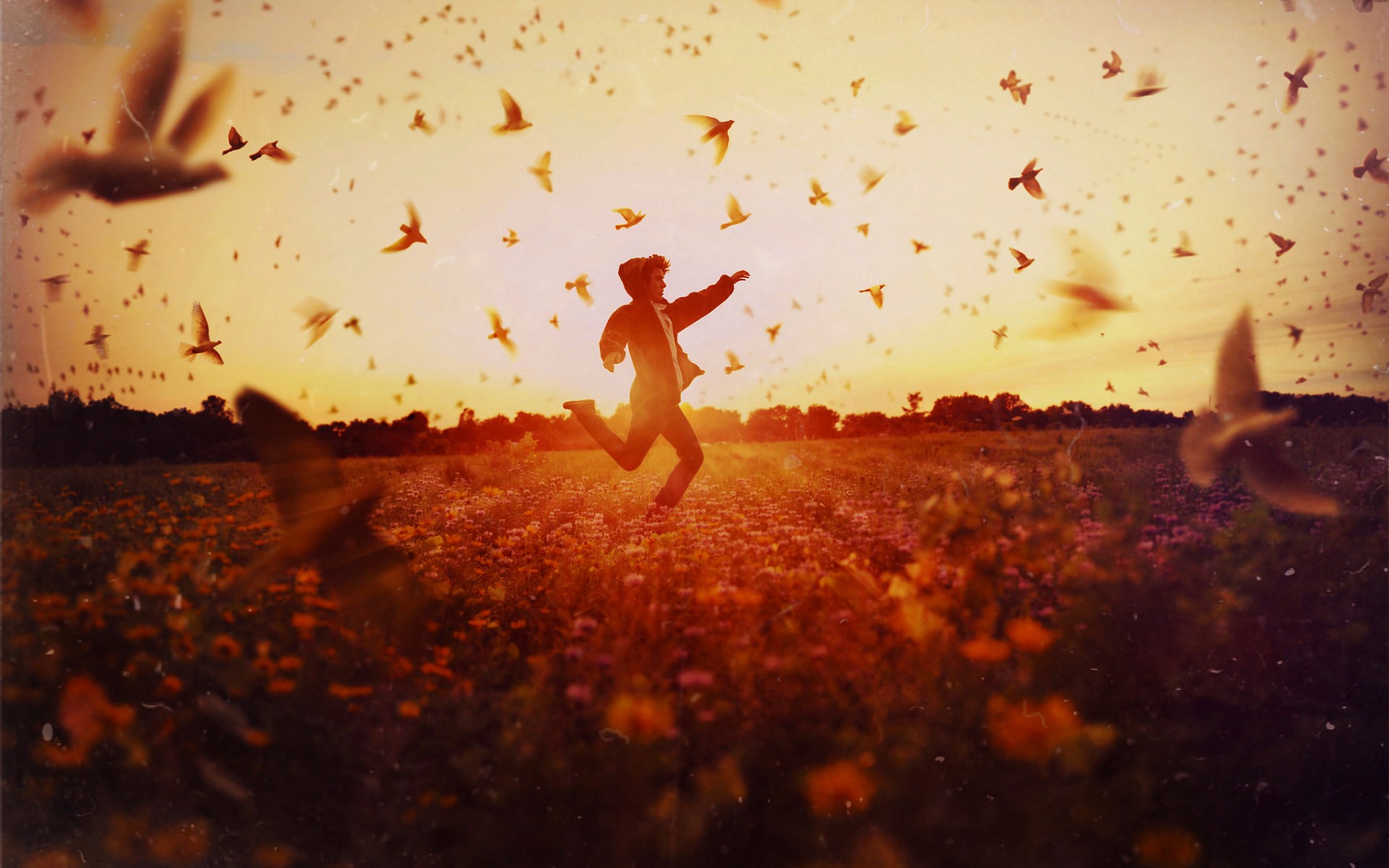 Description: A man running through a field with a flock of birds flying around him at sunset or dawn or dawn.