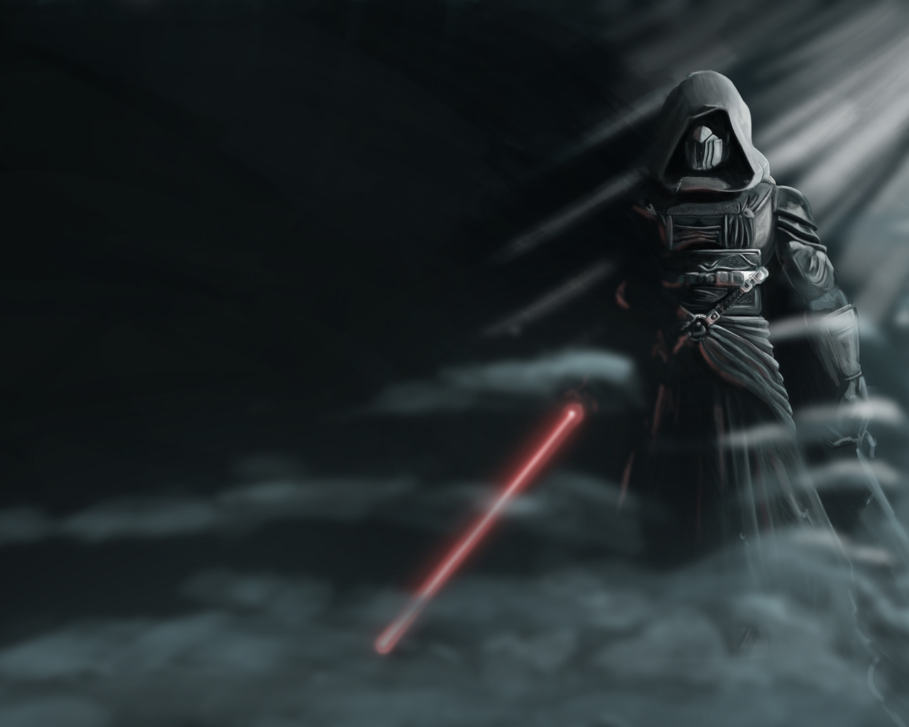 Description: A man in a dark suit holding a light saber in the clouds with a red light behind him and a black background.