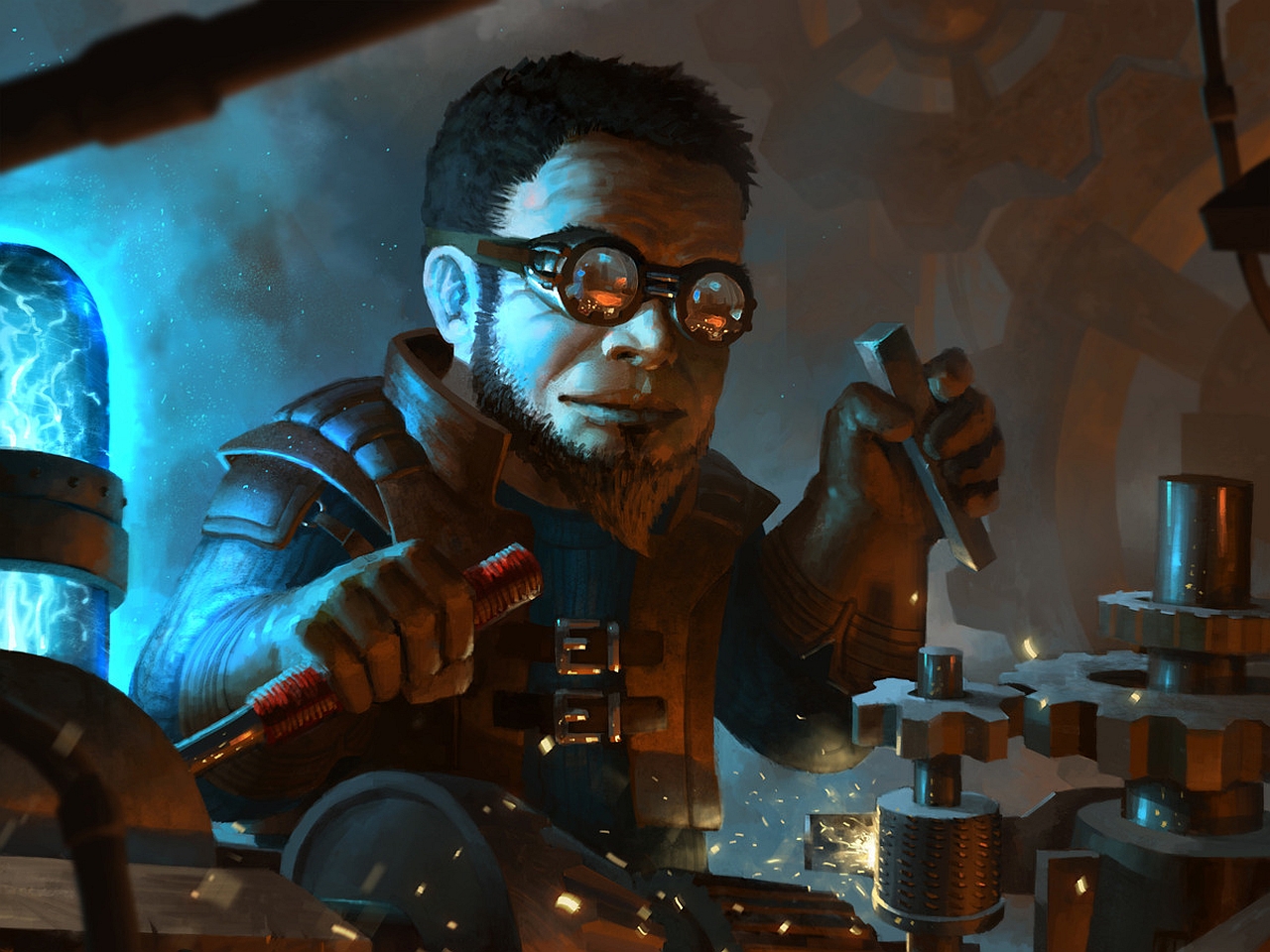 Description: A man in a science fiction scene holding a pipe and a tool in his hand and looking at the camera.