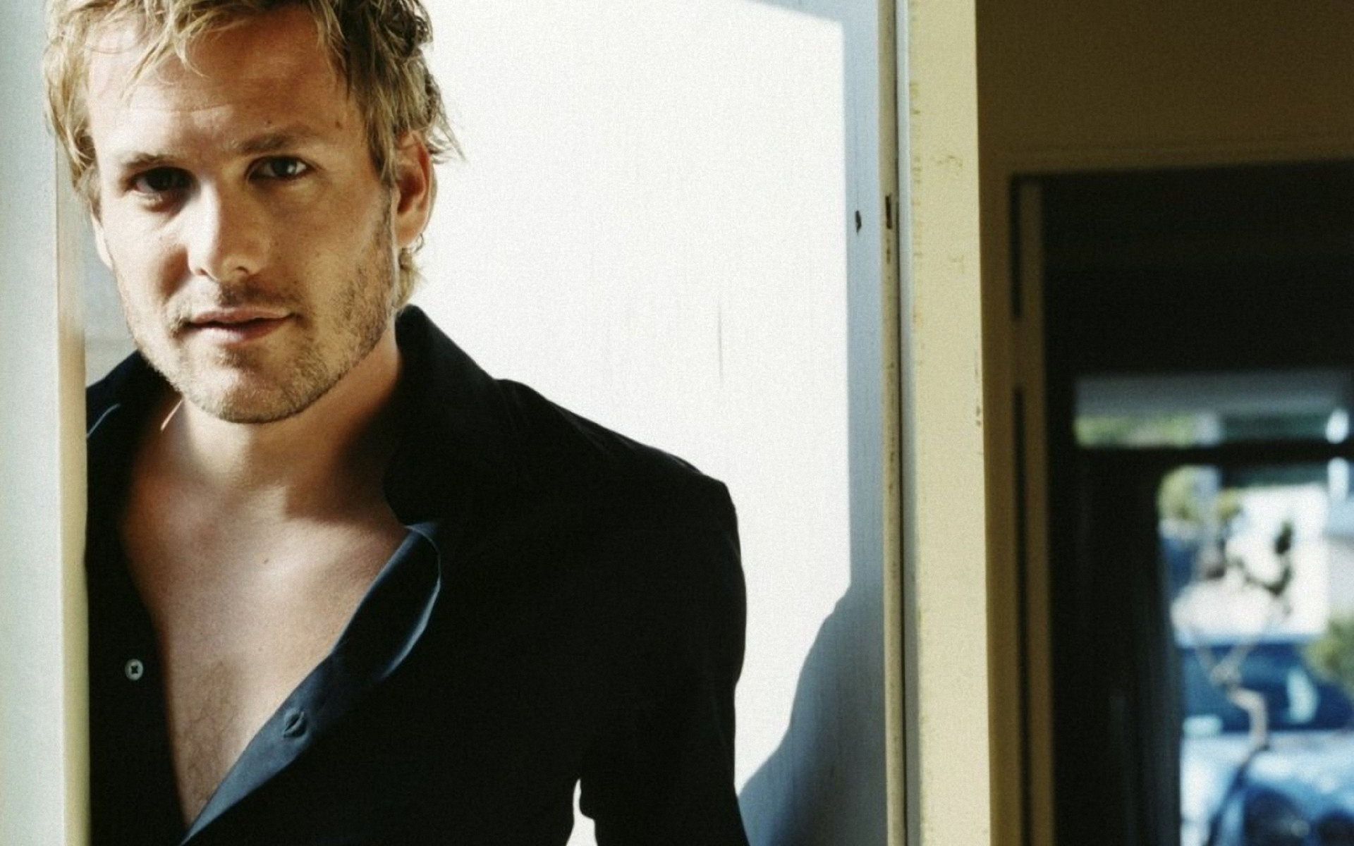 Description: A man standing in front of a door with his shirt open and looking at the camera with a serious look on his face.