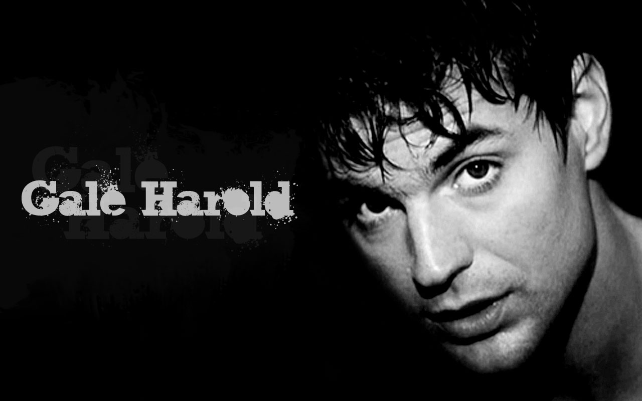 Description: A man with a shirt on is staring at the camera with a black background and the words gale hard.