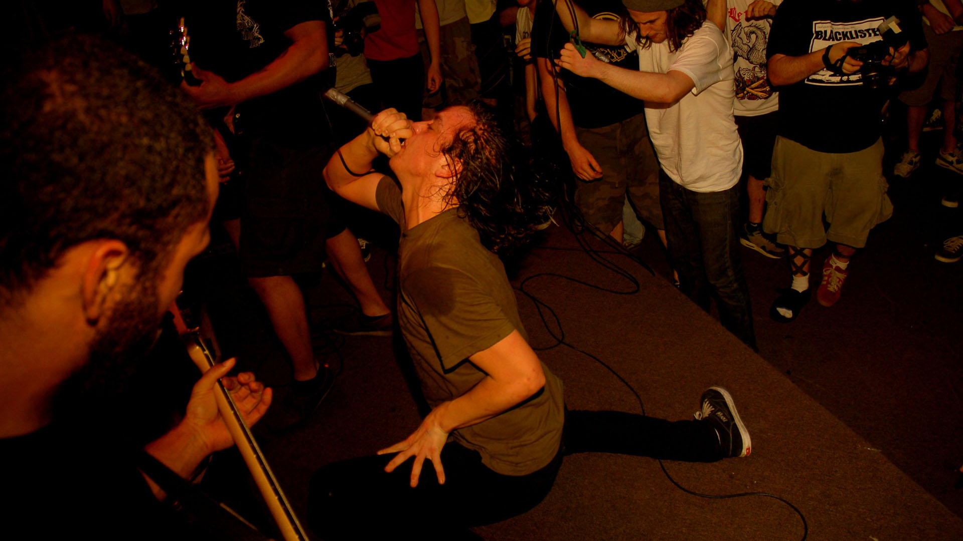 Description: A man singing into a microphone while standing in front of a group of people holding microphones in his hands.