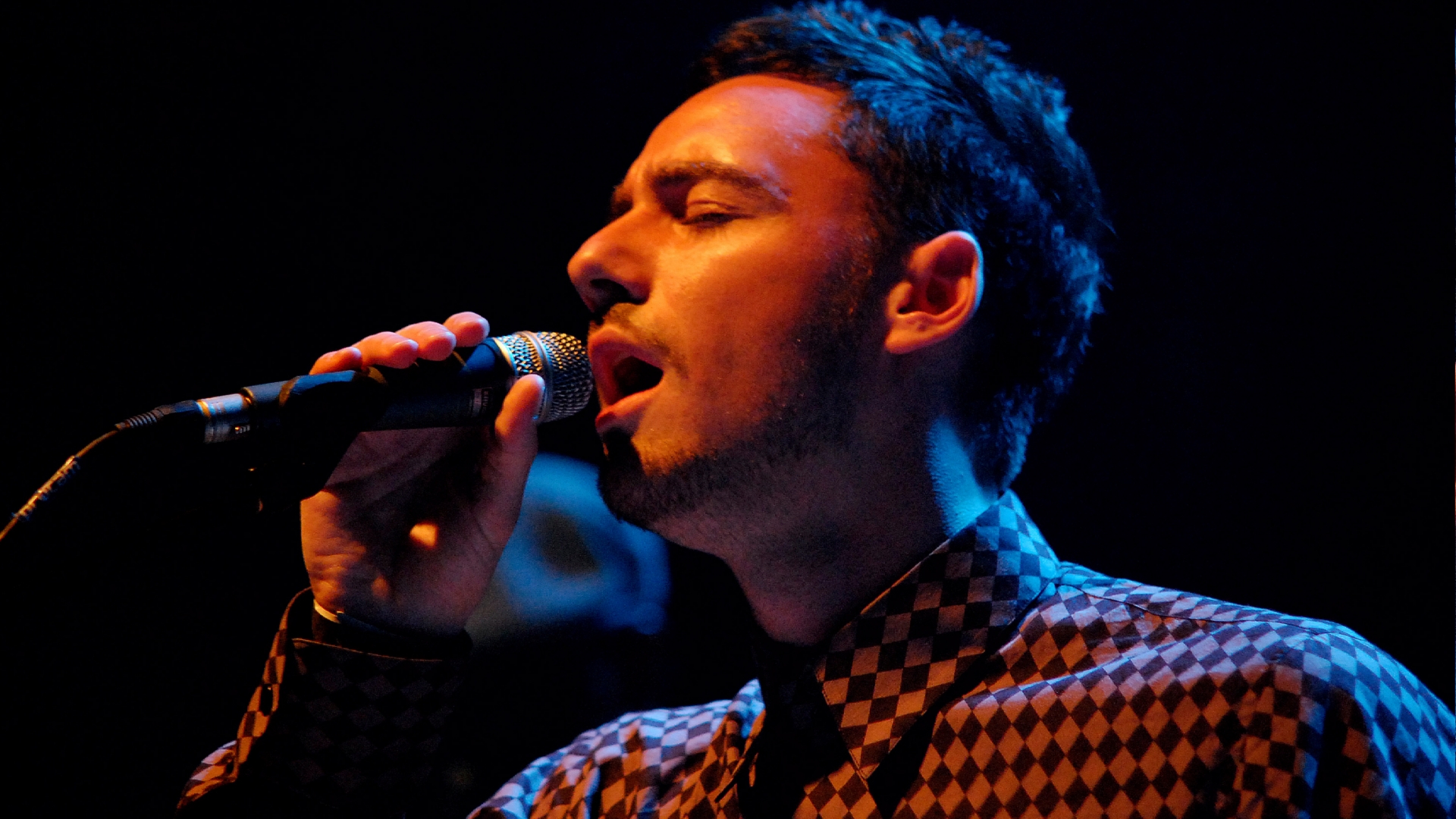 Description: A man singing into a microphone on stage at a concert or concert with a checkered shirt on his shirt.