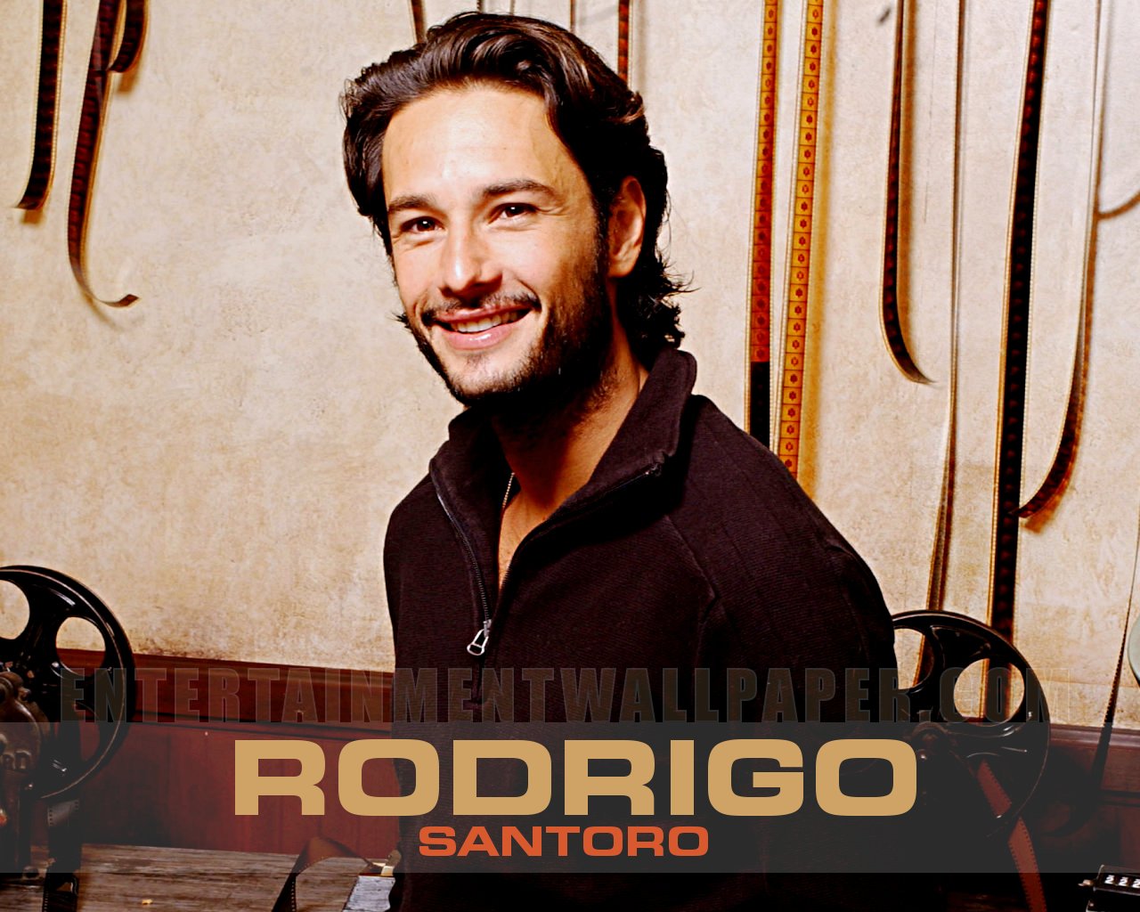 Description: A man sitting in front of a camera in a room with a wallpapered background and a sign that says rodrigo sanito.