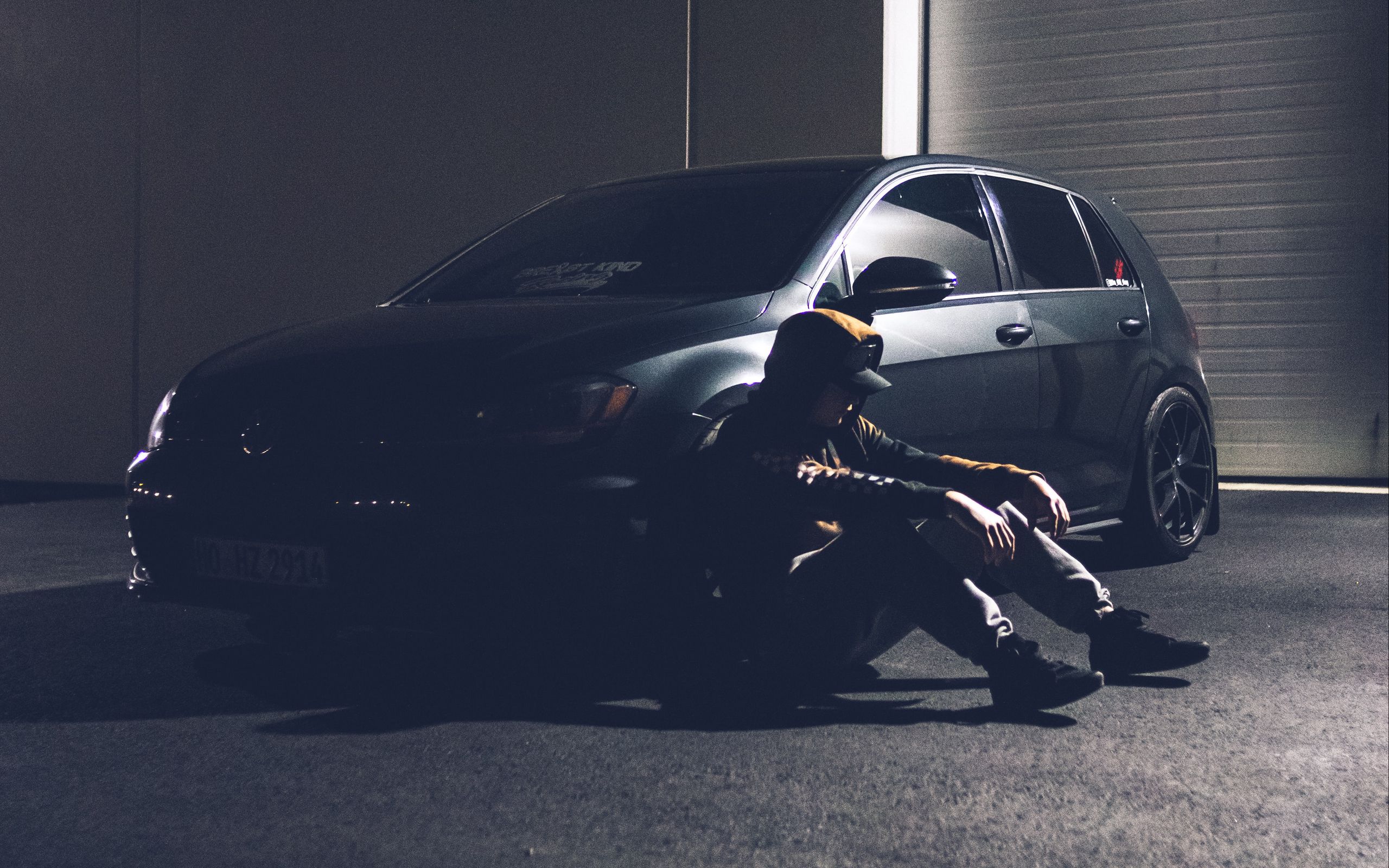 Description: A man sitting on the ground next to a car in a garage area with a garage door open and a garage door behind him.