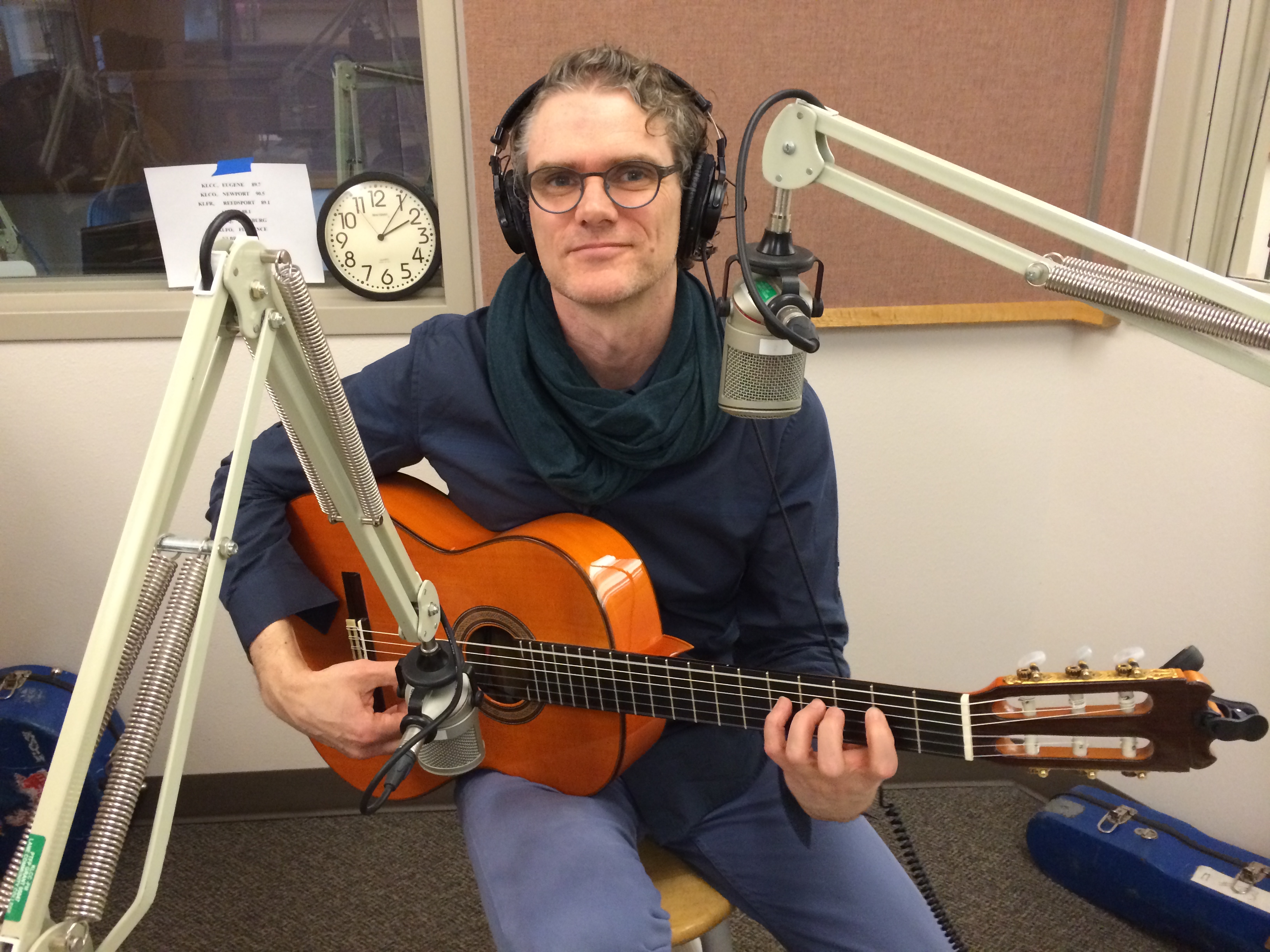 Description: A man sitting in a chair with a guitar and headphones on his head and a microphone in front of him.