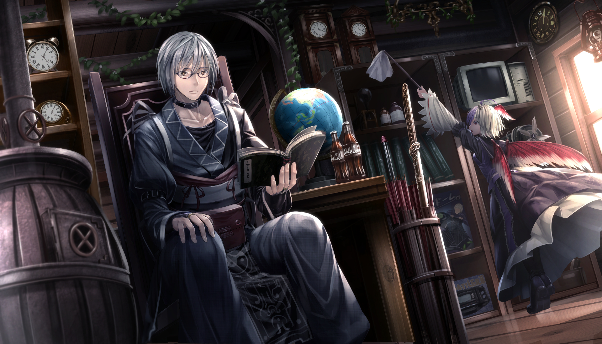 Description: A man sitting in a chair in a room with a clock and a globe on the table next to him.