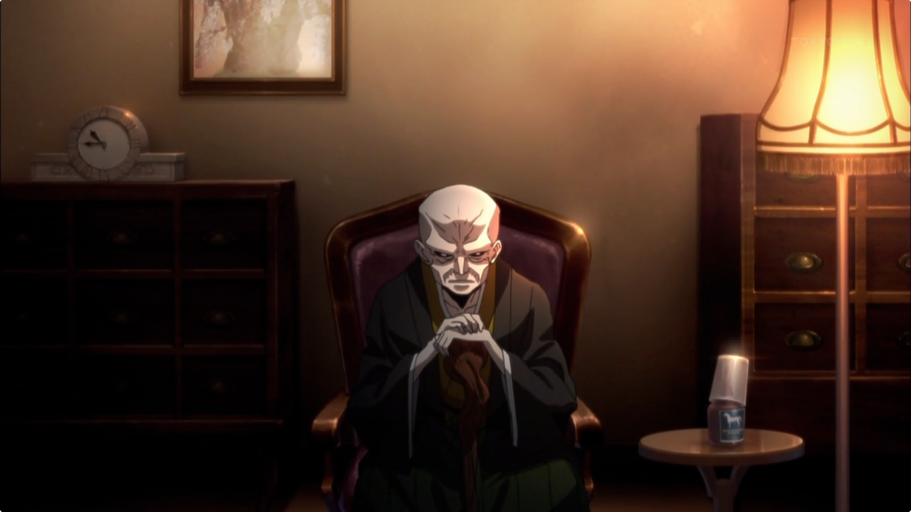 Description: A man sitting in a chair in a room with a lamp on the side of the room and a clock on the wall.