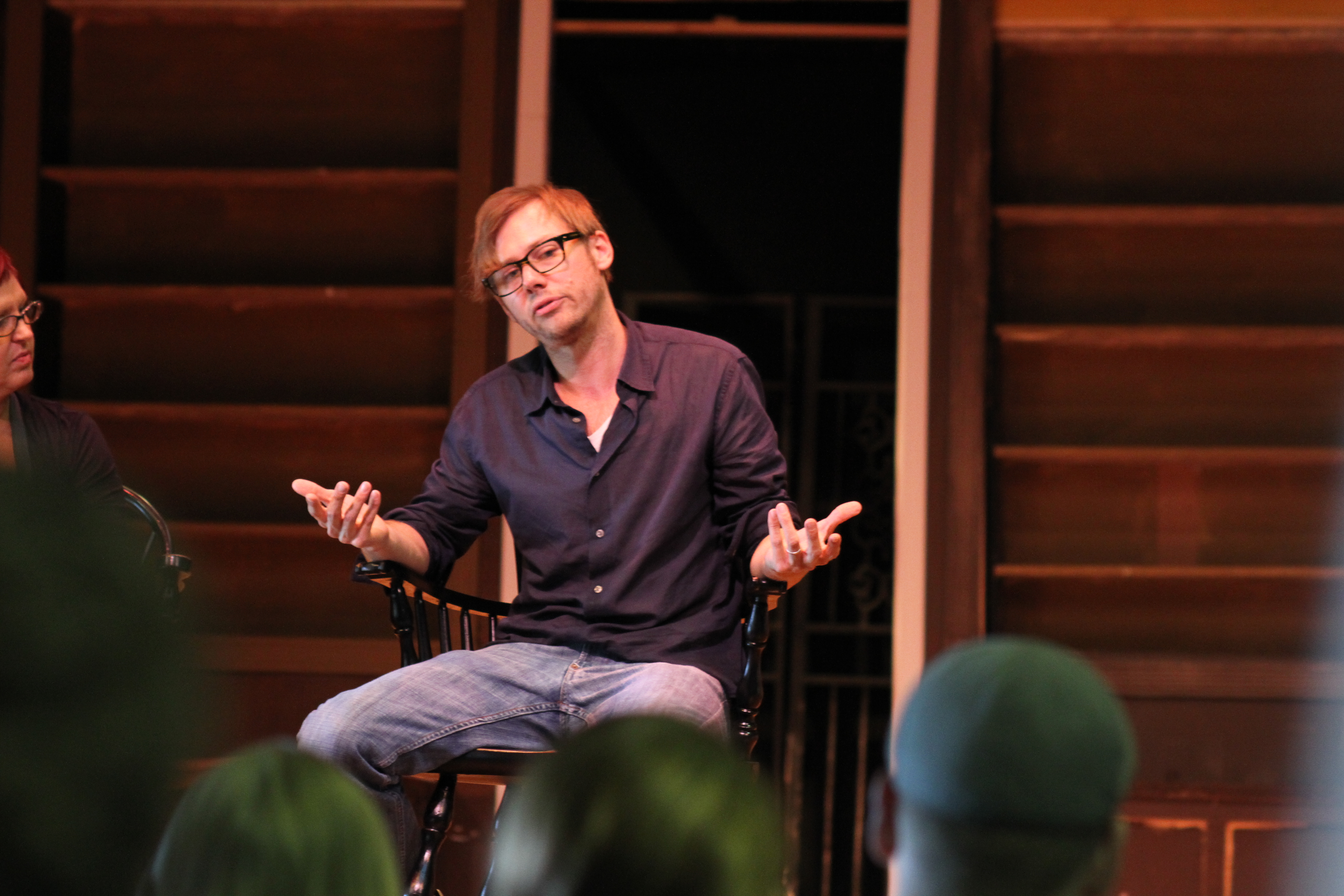 Description: A man sitting in a chair talking to a woman in a black shirt and jeans and a green hat.