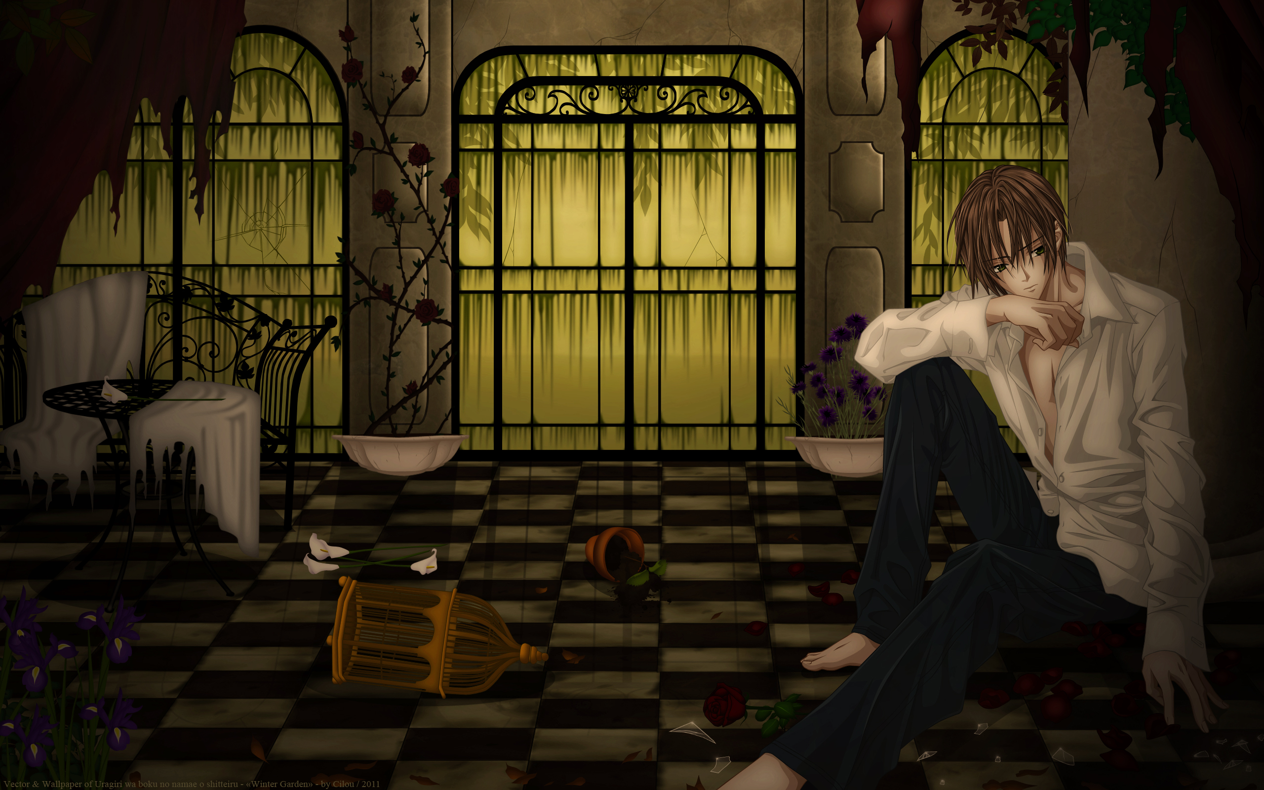 Description: A man sitting on a checkered floor in a room with a window and a table with a vase.