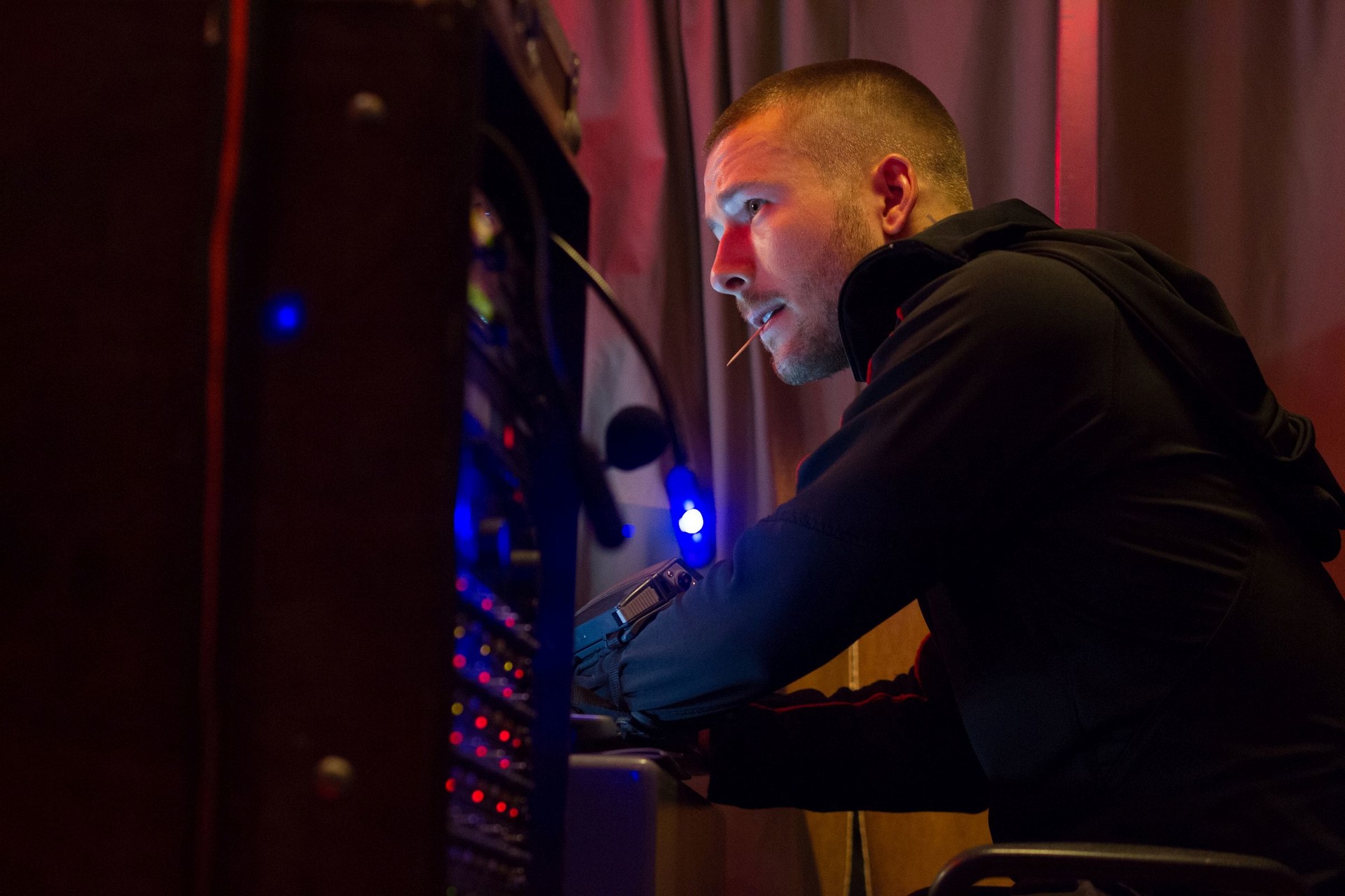 Description: A man sitting in front of a computer monitor with a light on it's side and a microphone in his mouth.