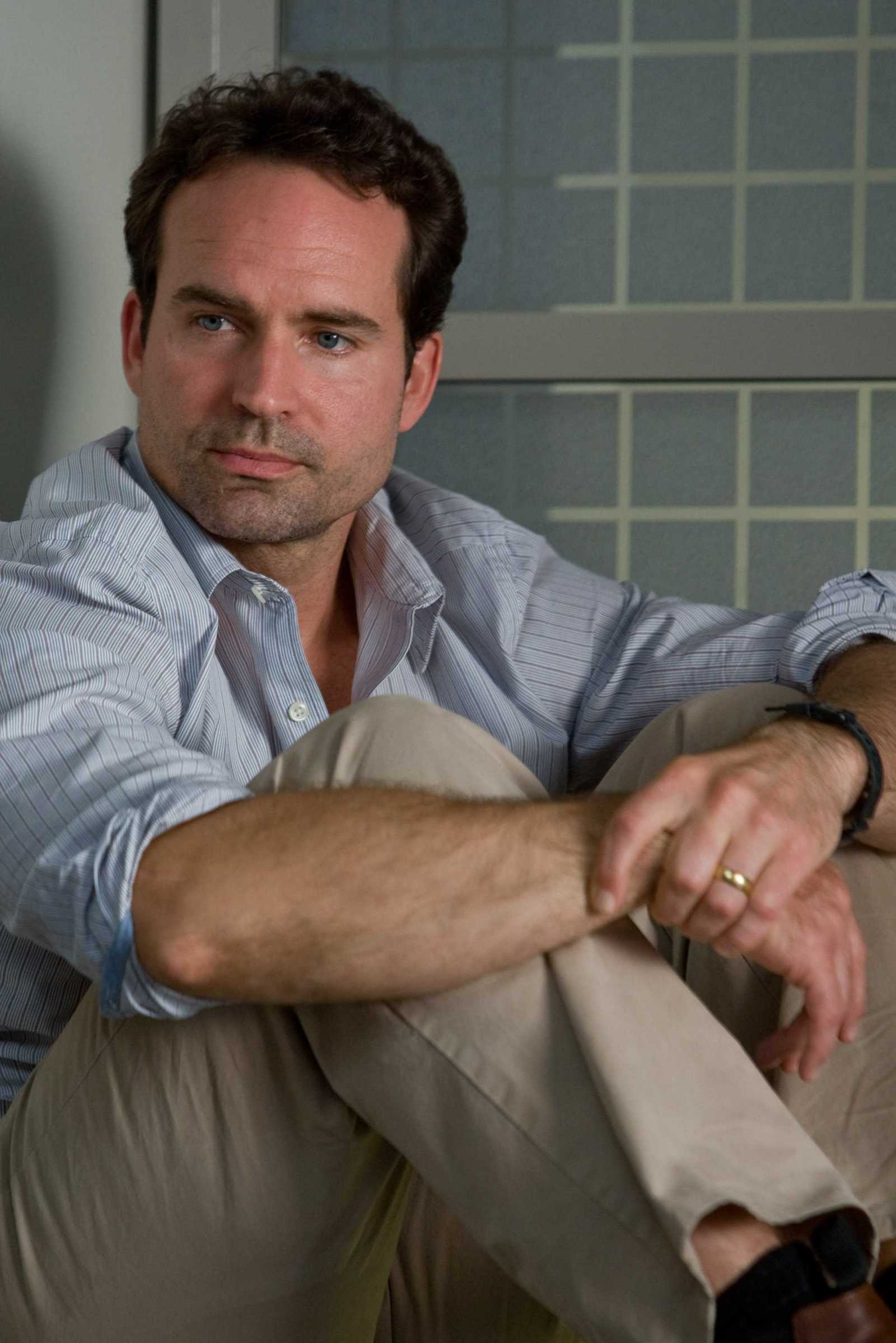 Description: A man sitting on a couch with his legs crossed and his hand on his knee.