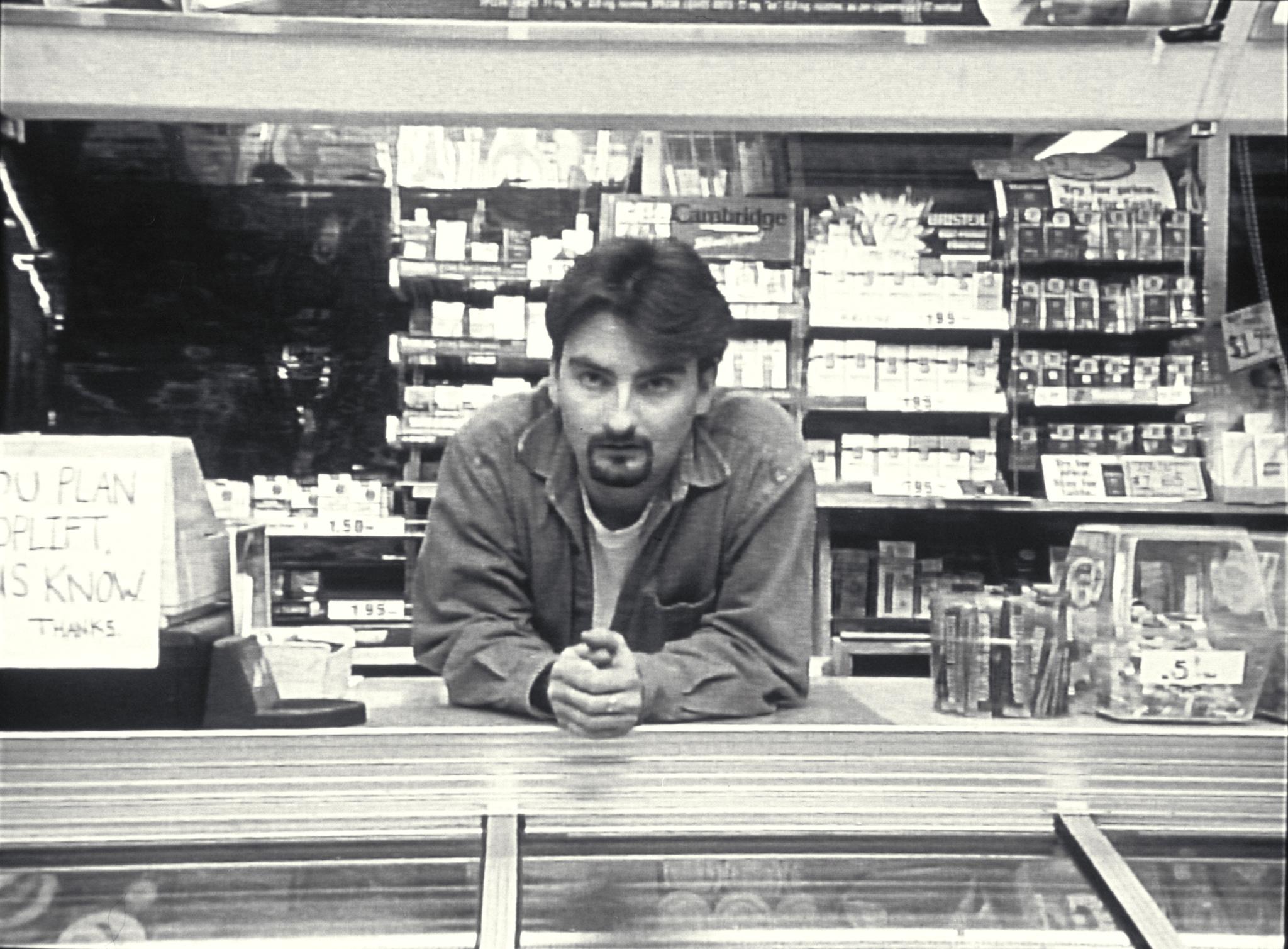 Description: A man sitting at a counter in a store looking at his cell phone in front of him.