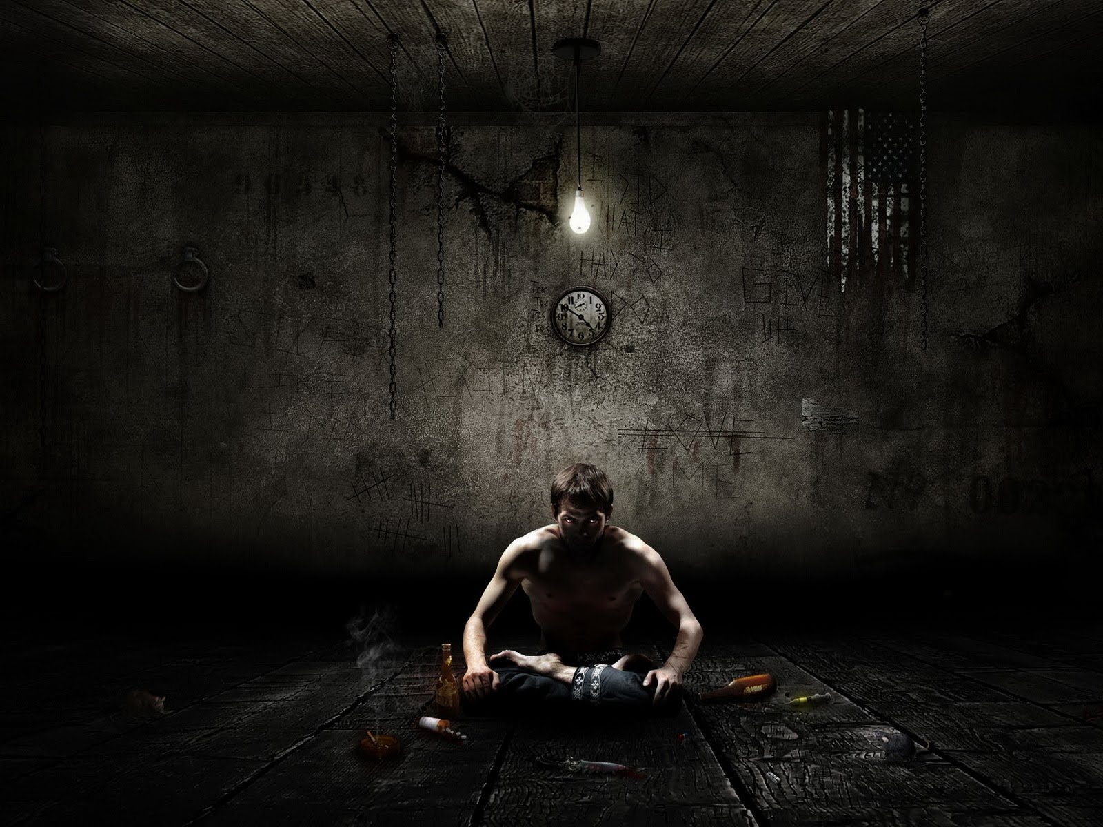 Description: A man sitting on the floor in a dark room with a clock on the wall behind him and a cigarette in his hand.