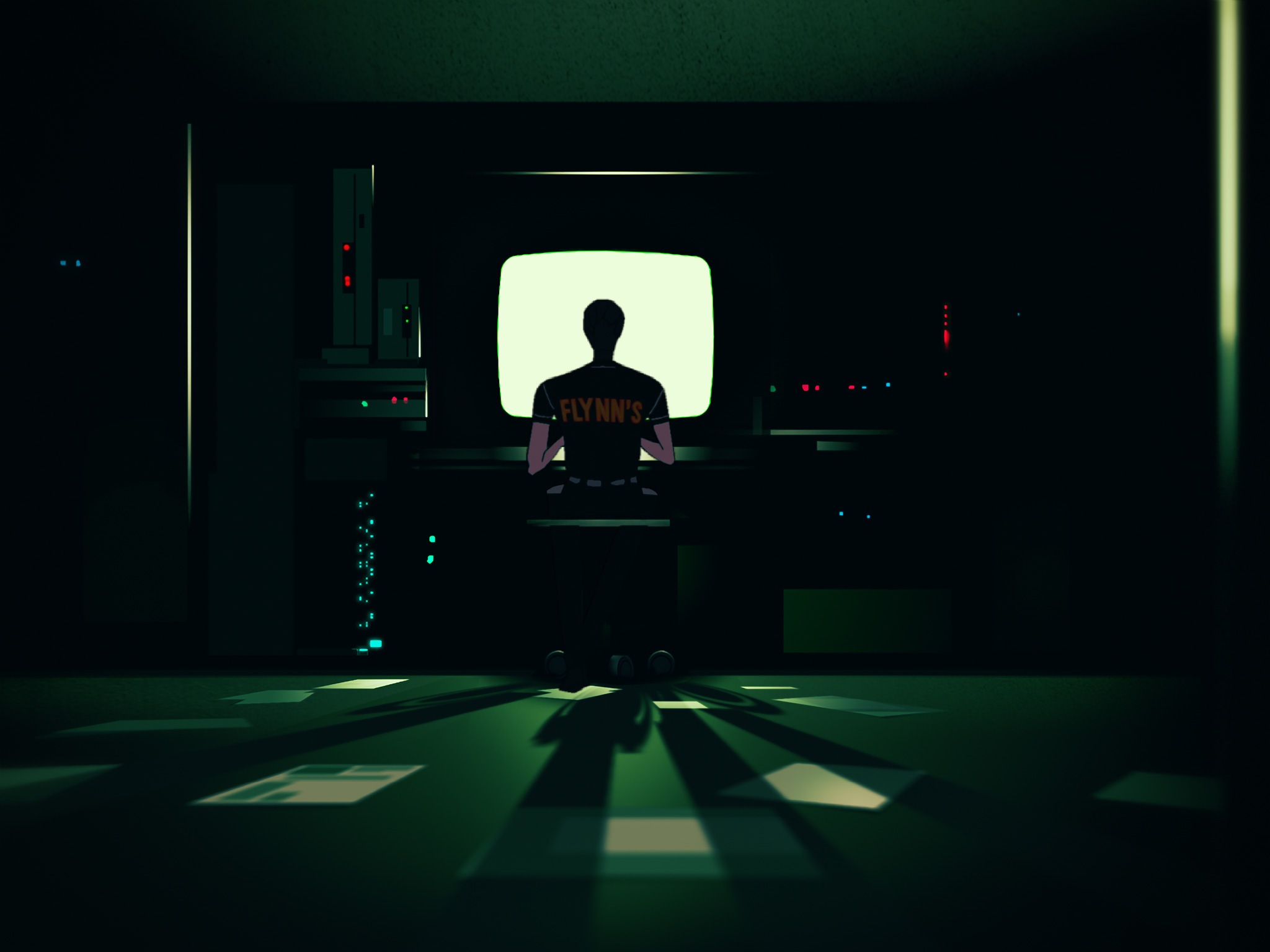 Description: A man sitting in a dark room in front of a tv with a neon light on it's screen.