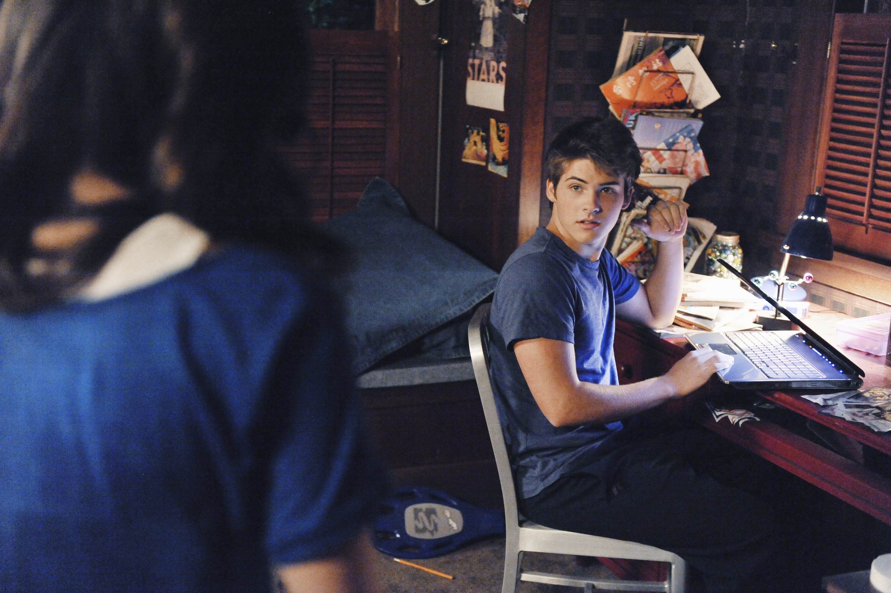 Description: A man sitting at a desk with a laptop computer in front of him and a woman standing behind him.