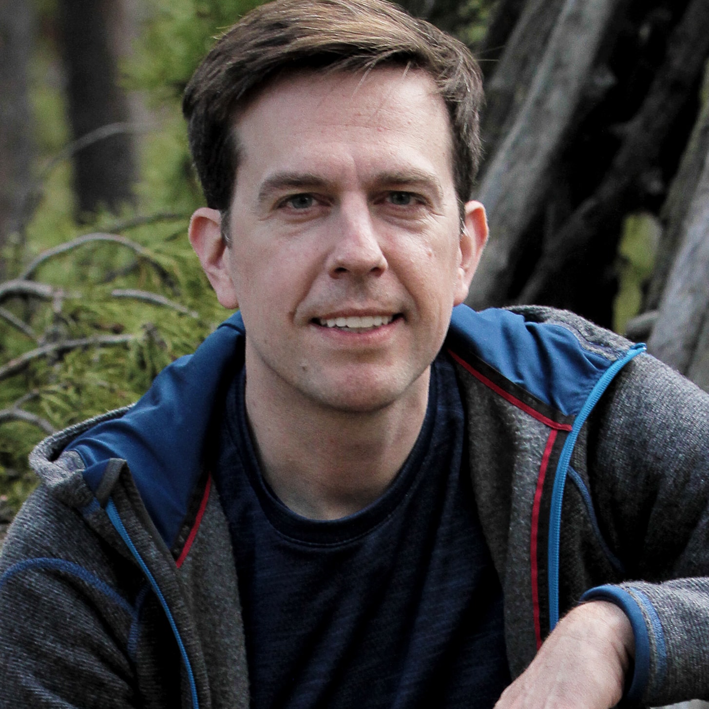 Description: A man sitting in a forest with a pizza in his hand and a pizza in his other hand.