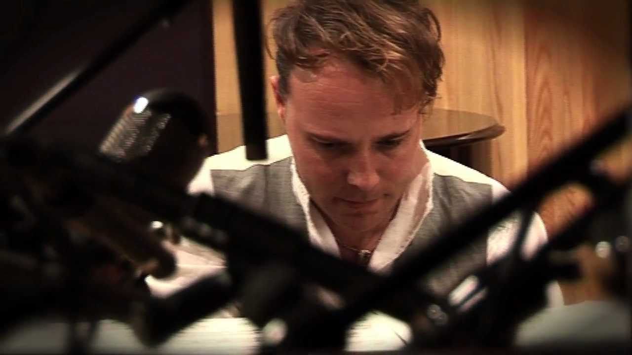 Description: A man sitting in front of a microphone in a recording studio looking at a piece of paper with a pen in it.