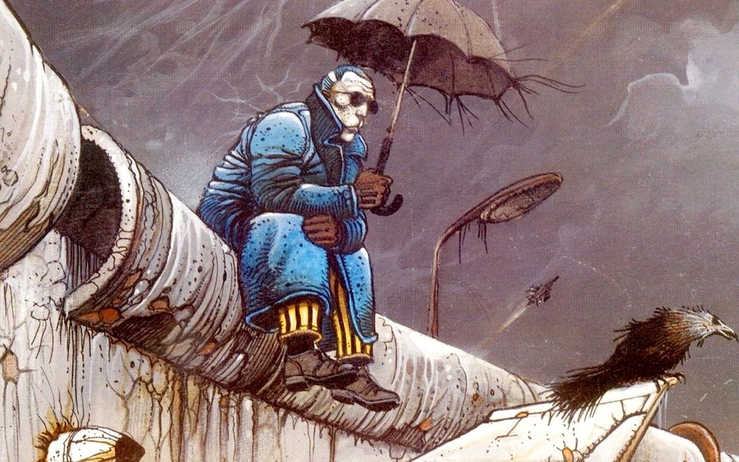 Description: A man sitting on a pipe with an umbrella over his head and a bird standing on the pipe next to him.