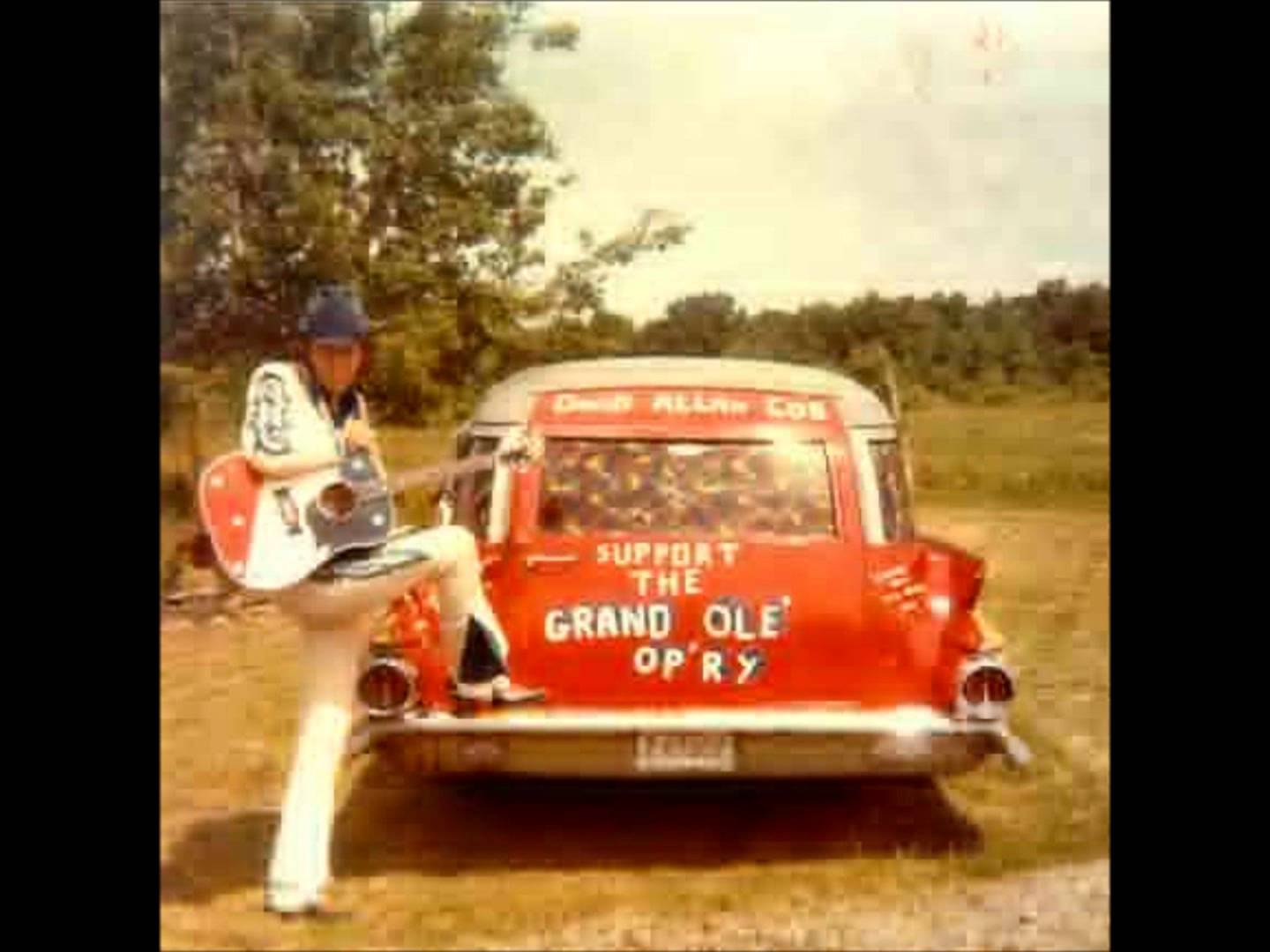 Description: A man sitting on top of a red car with a guitar in his hand and a sign on the back of it.