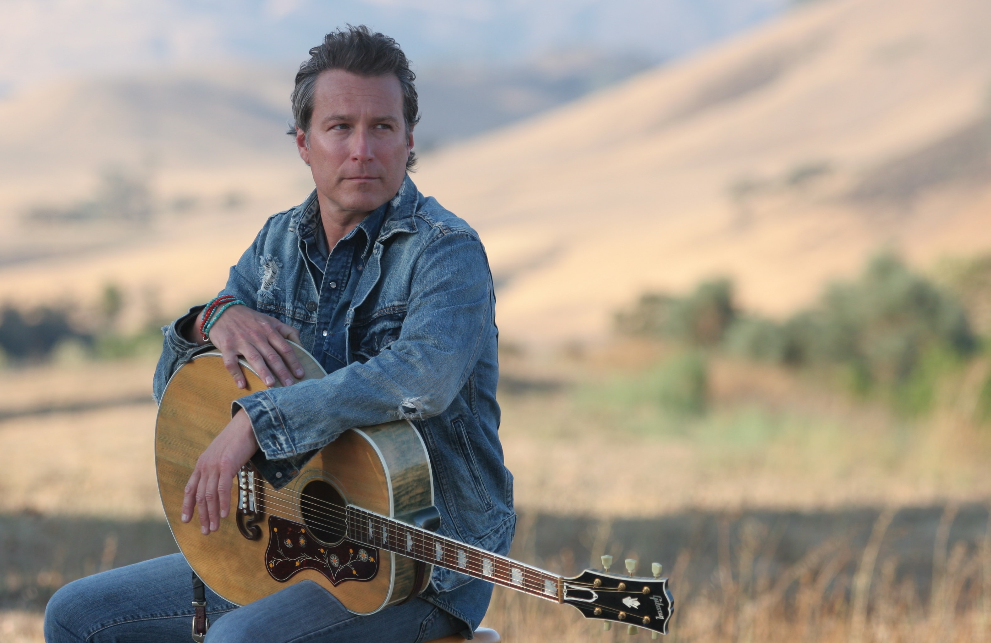 Description: A man sitting on a rock with a guitar in his lap and a mountain in the background with a sky.