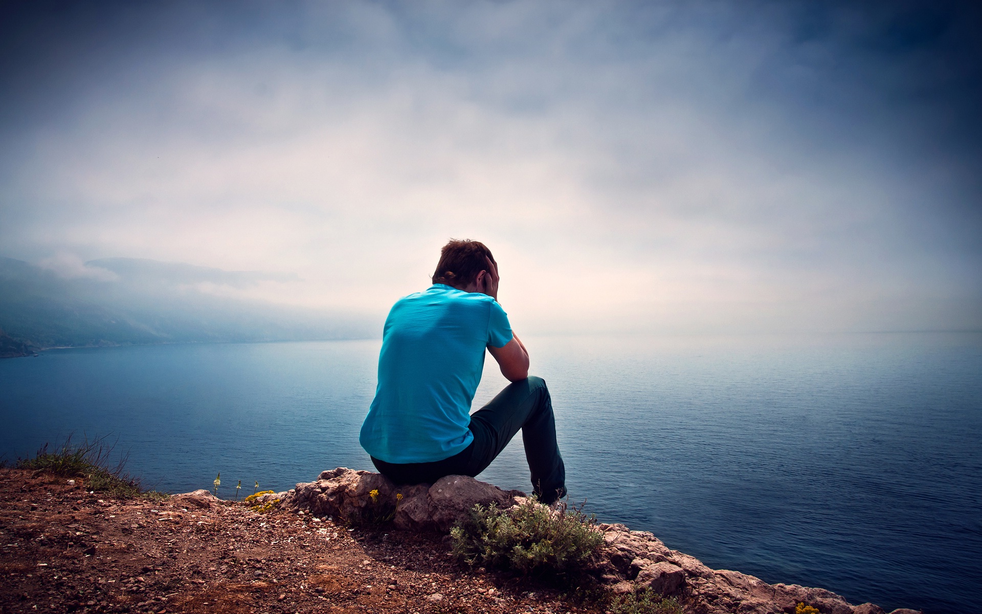 Description: A man sitting on a rock looking out over the ocean on a cloudy day with a blue shirt and jeans.