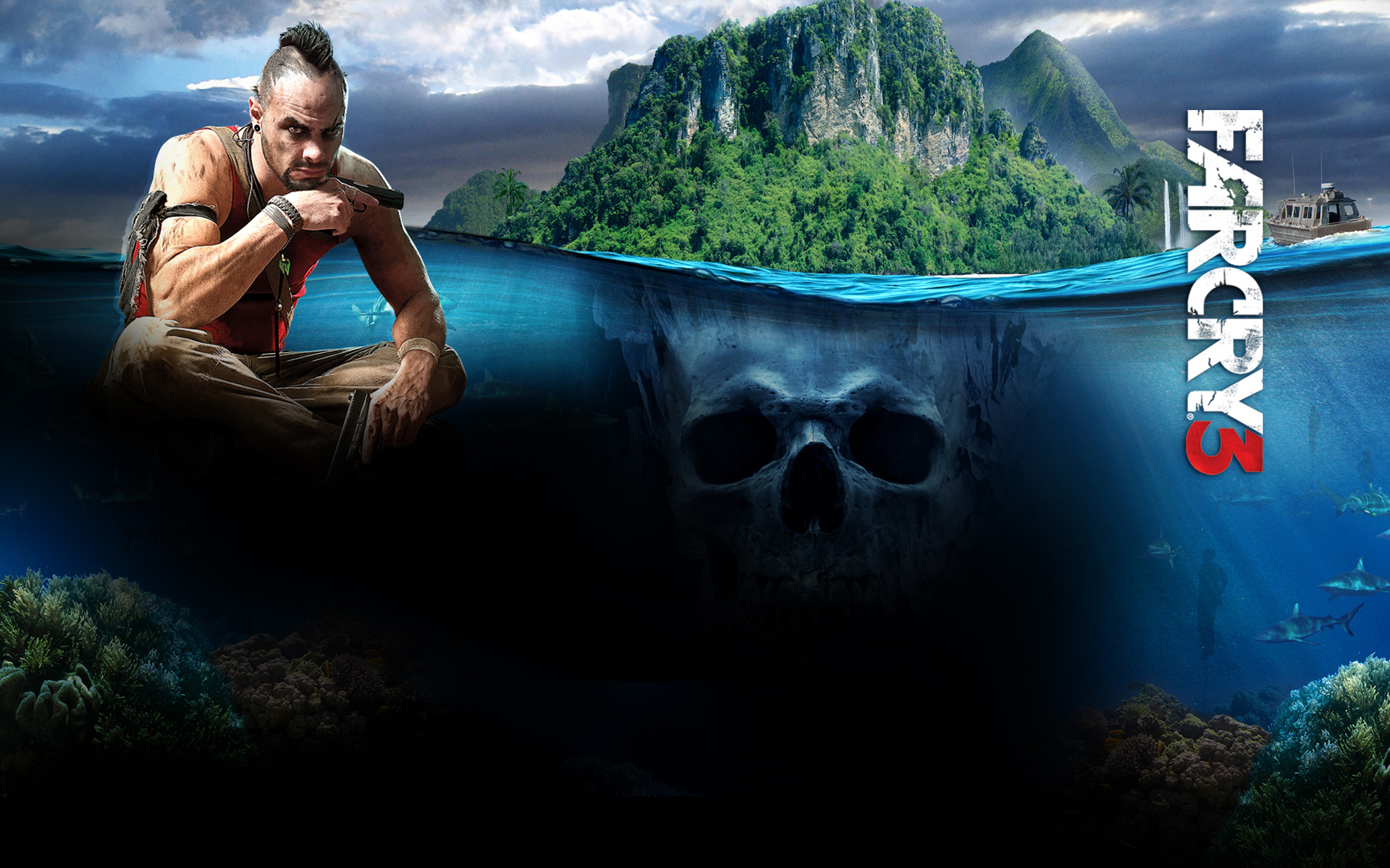 Description: A man sitting on a rock in the ocean with a skull in the water and a boat in the background.