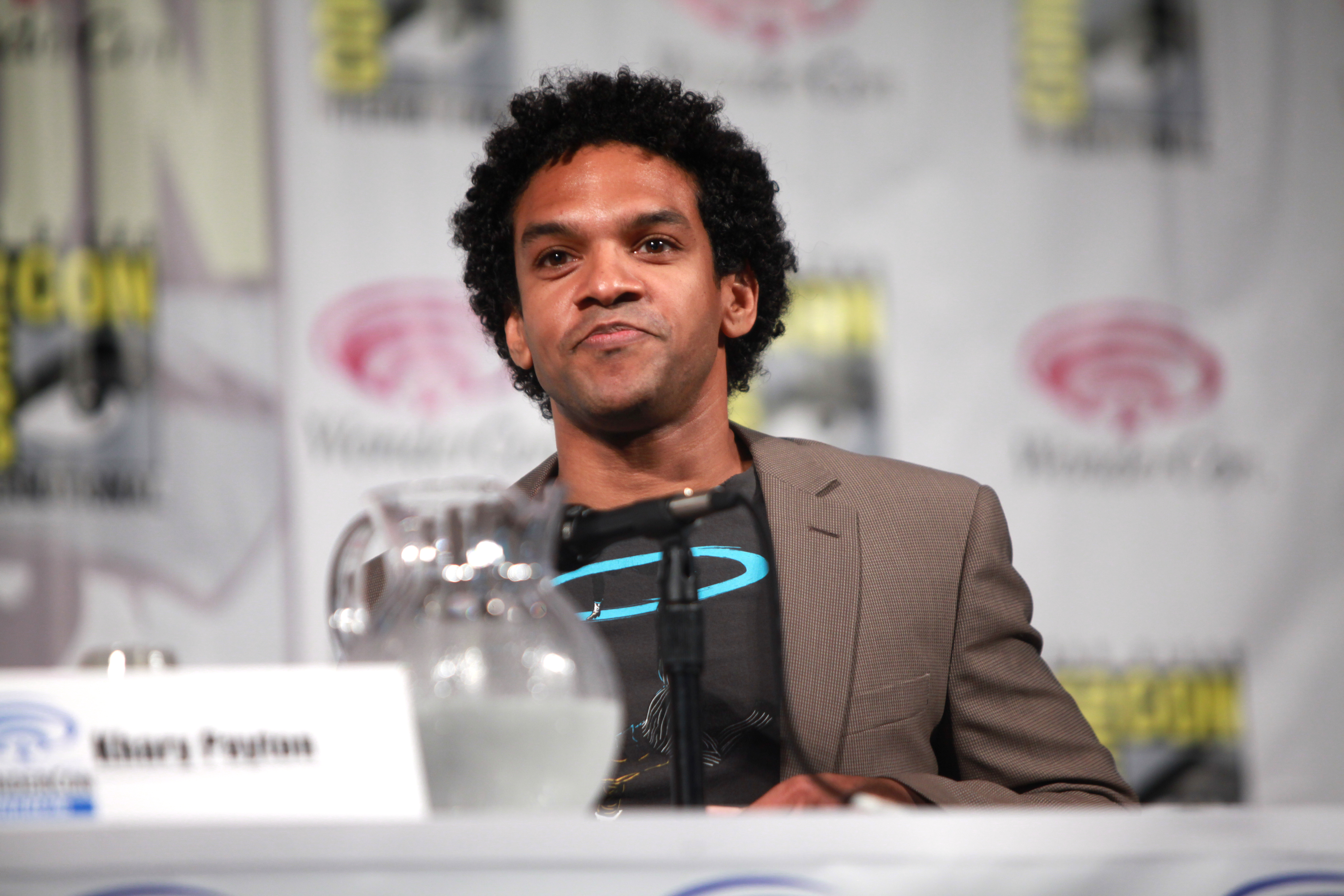 Description: A man sitting at a table with a glass of water in front of him and a microphone in front of him.