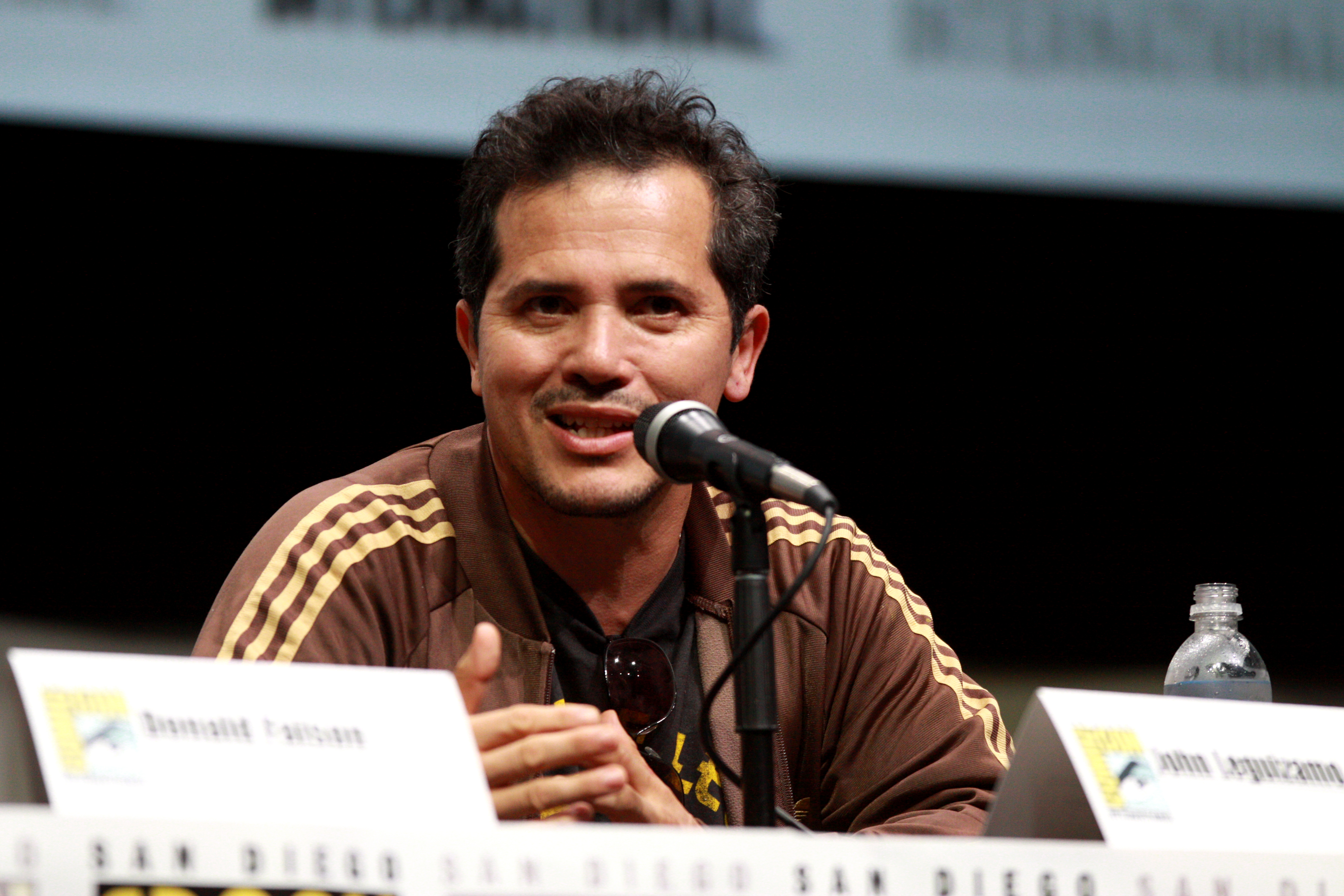 Description: A man sitting at a table with a microphone in front of him and a bottle of water behind him.