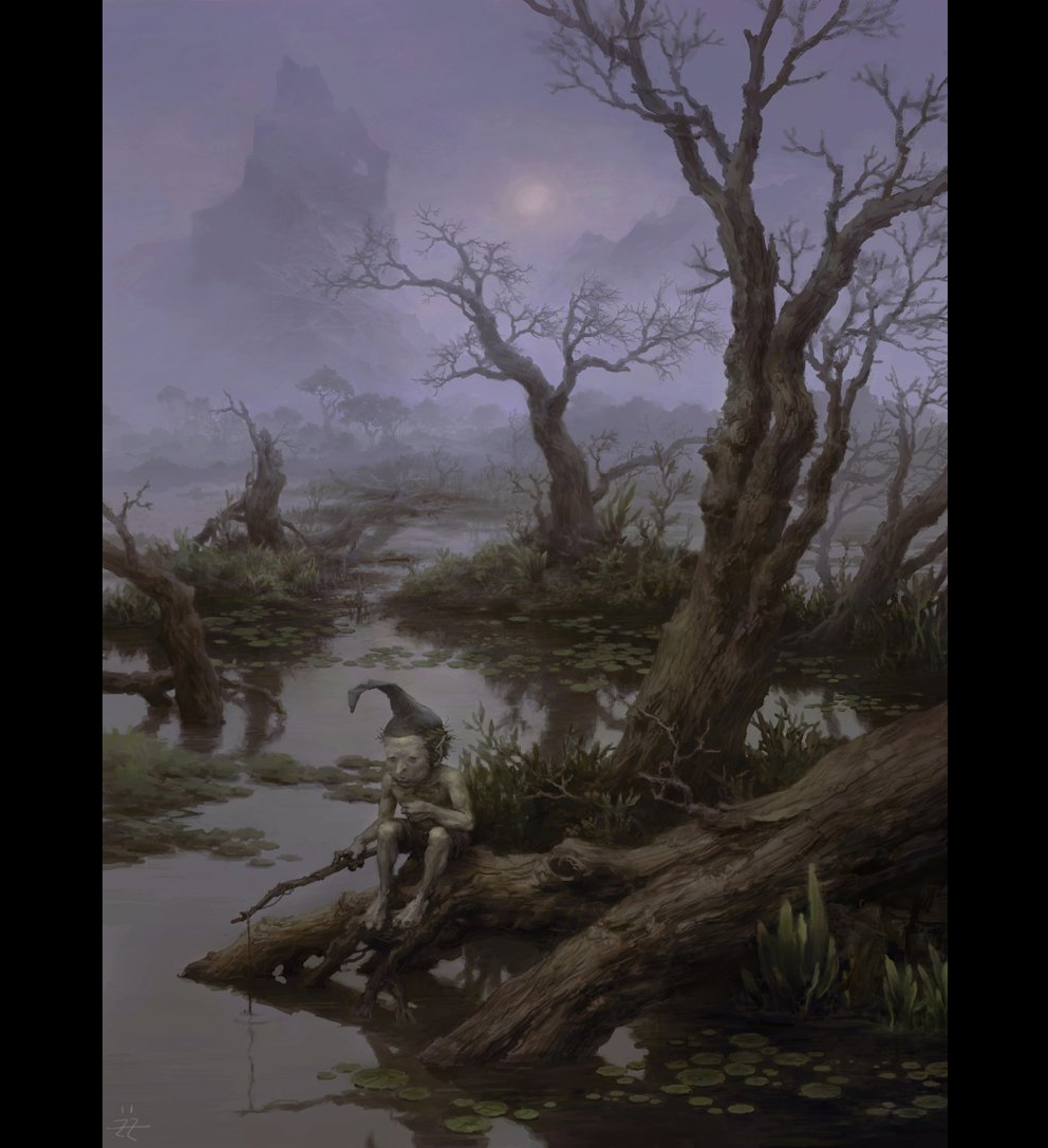 Description: A painting of a man sitting on a tree branch in a swampy area with a castle in the background.