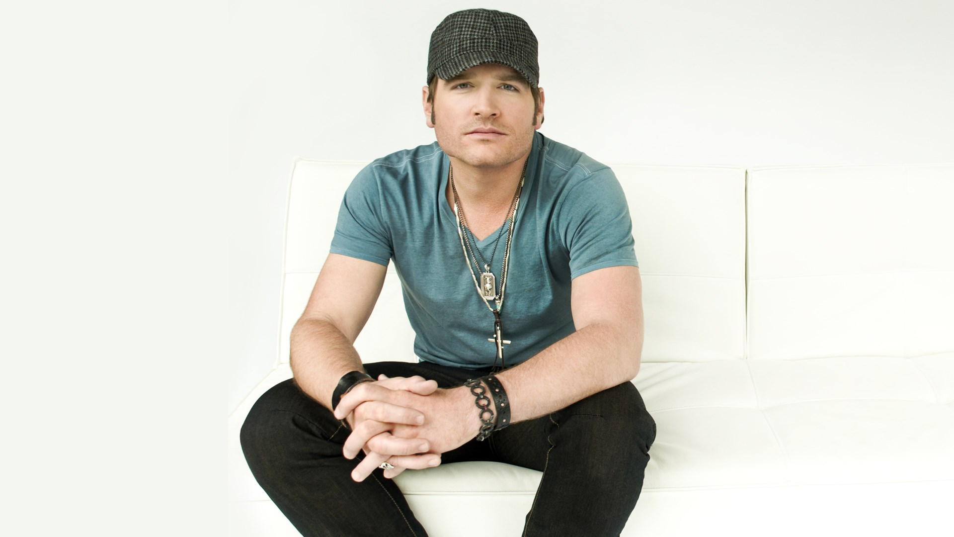 Description: A man sitting on a white couch wearing a hat and a necklace on his neck and hands folded out.
