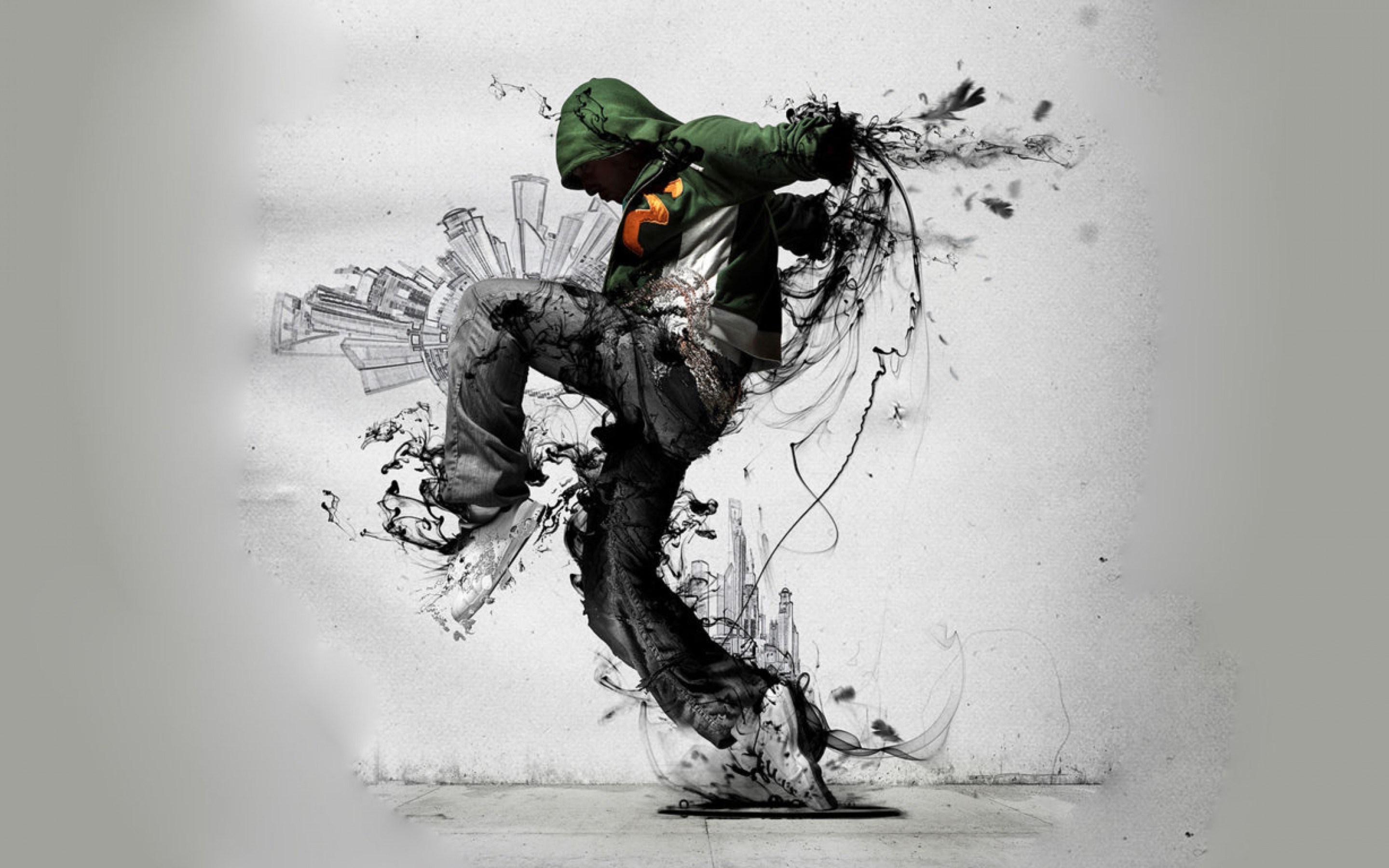 Description: A man riding a skateboard through the air with a green jacket on and a yellow tie on his neck.