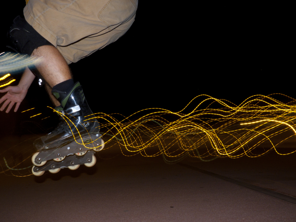 Description: A man riding a skateboard down a sidewalk at night with a long exposure of light behind him and a skateboard.