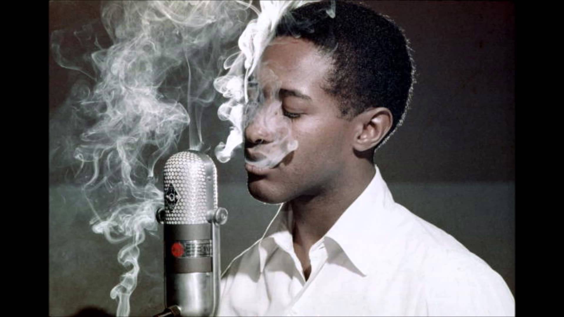 Description: A man smoking a cigarette in front of a microphone with smoke coming out of it and a cigarette in his mouth.