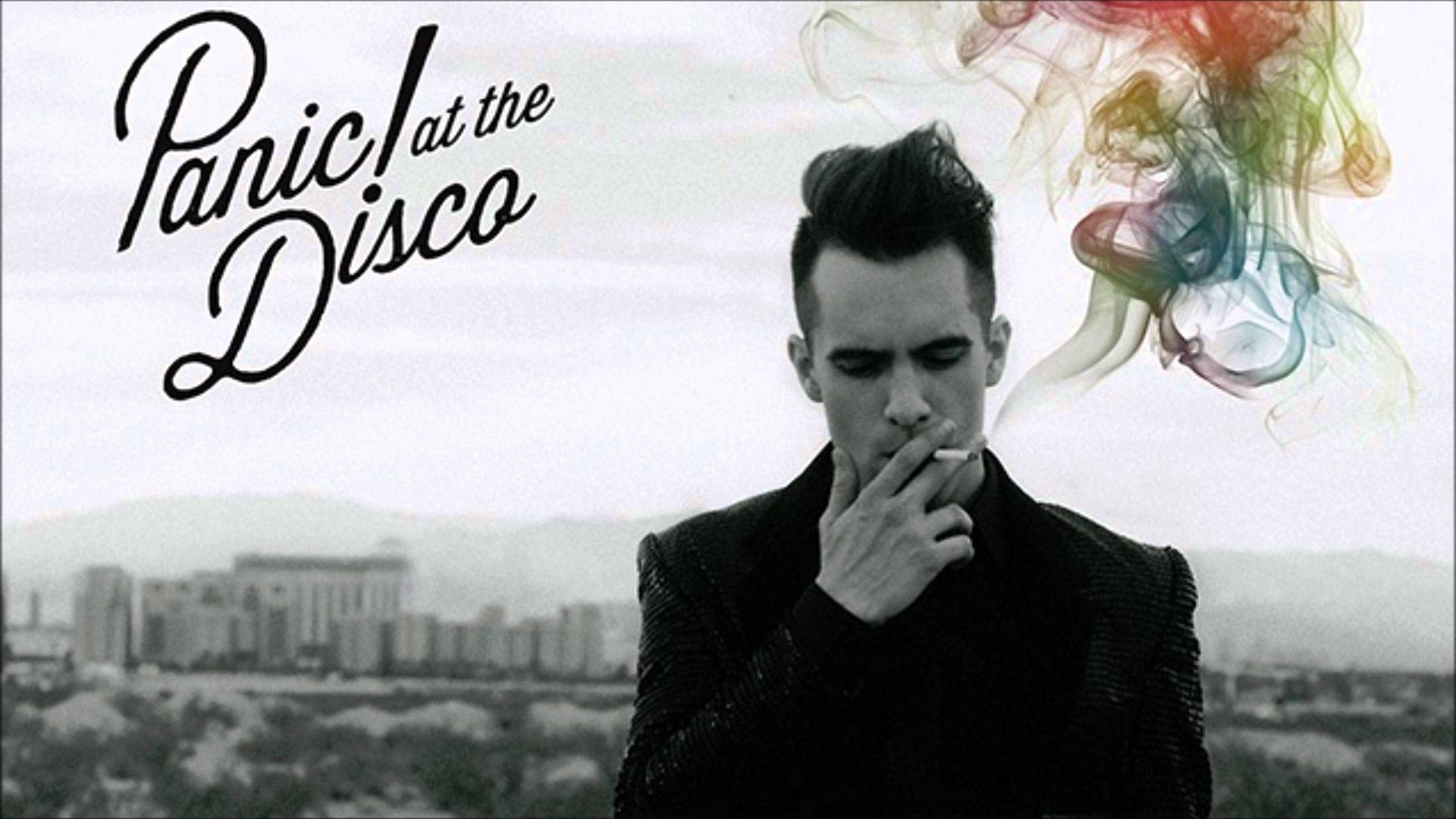 Description: A man smoking a cigarette in front of a cityscape with a rainbow swirl in the background and a hand written panic at the disco.