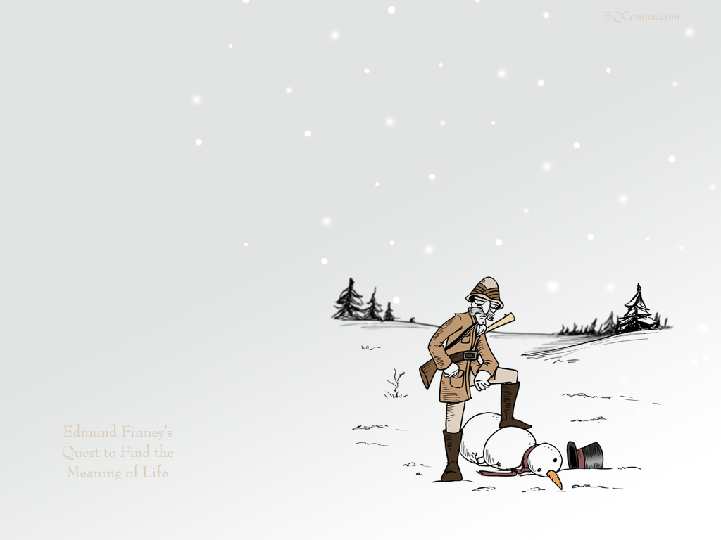 Description: A man is standing in the snow with a snowman and a snowball in front of him and a snowman behind him.
