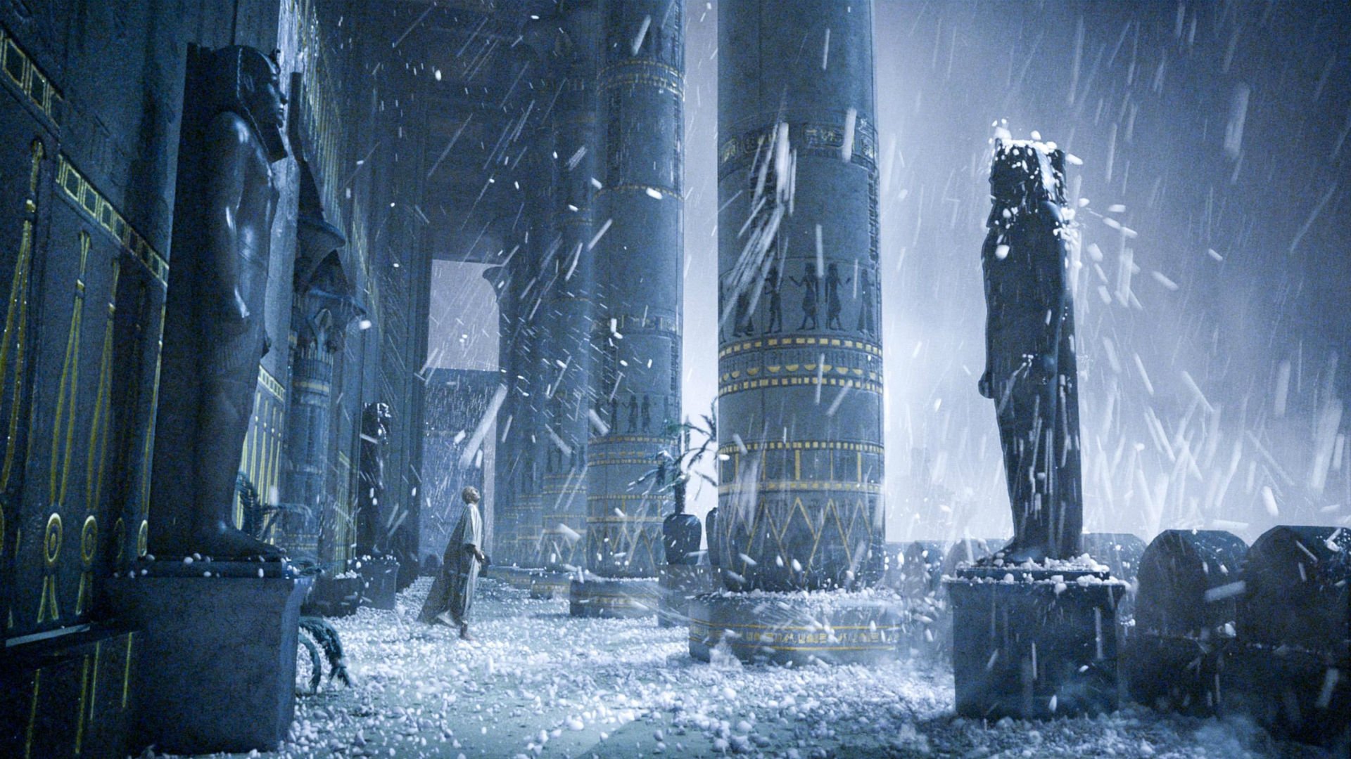 Description: A man standing in the snow in a city with tall buildings and a statue in the background with snow falling all around.