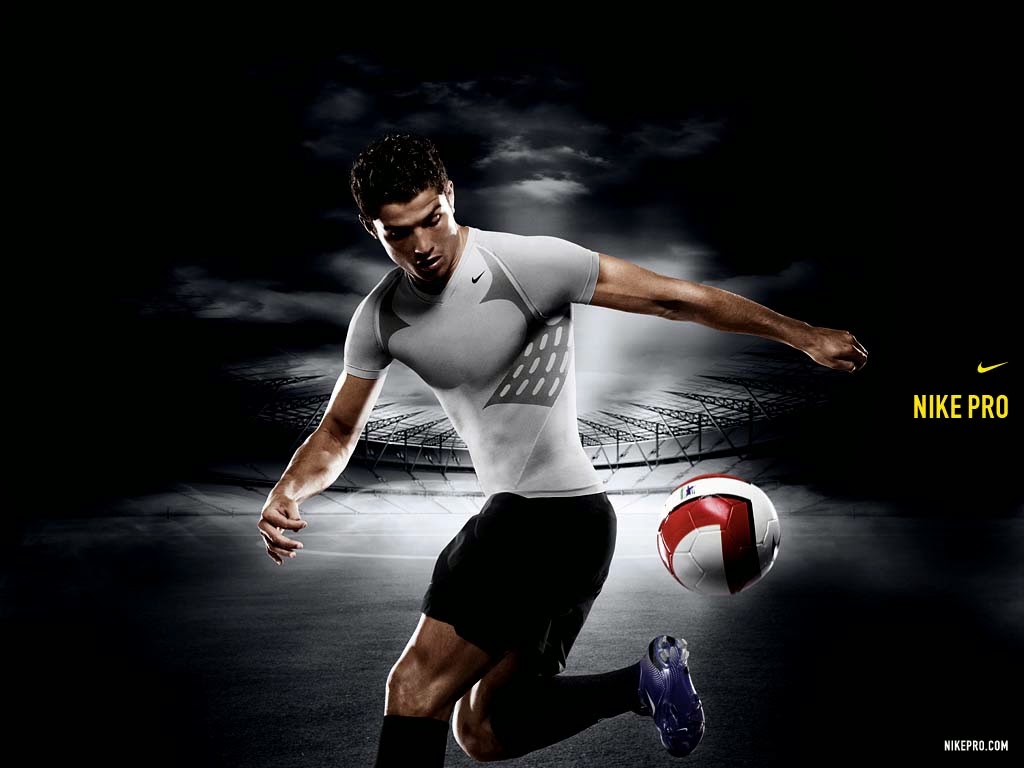 Description: A man in a white shirt and black shorts kicking a soccer ball in a dark stadium with a red and white nike logo.