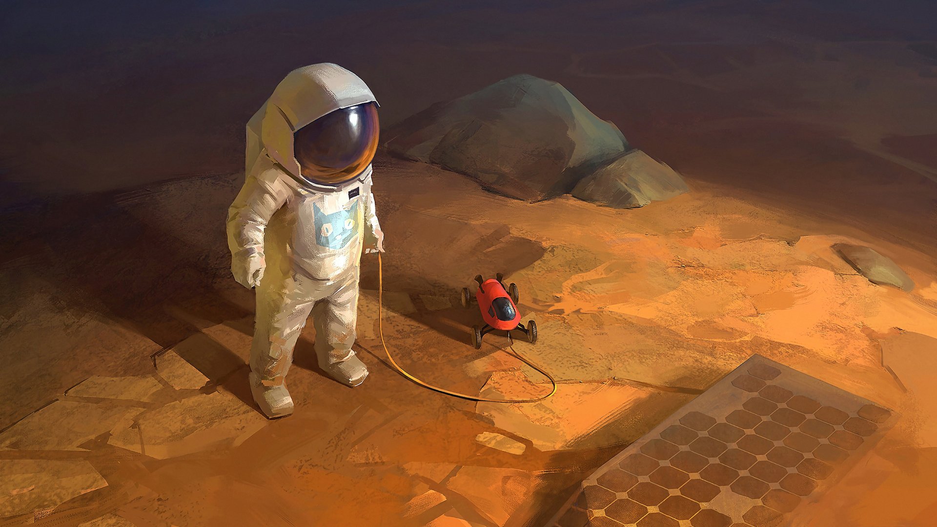 Description: A man in a space suit standing on a desert surface next to a red object in the distance with a rock outcropping in the background.