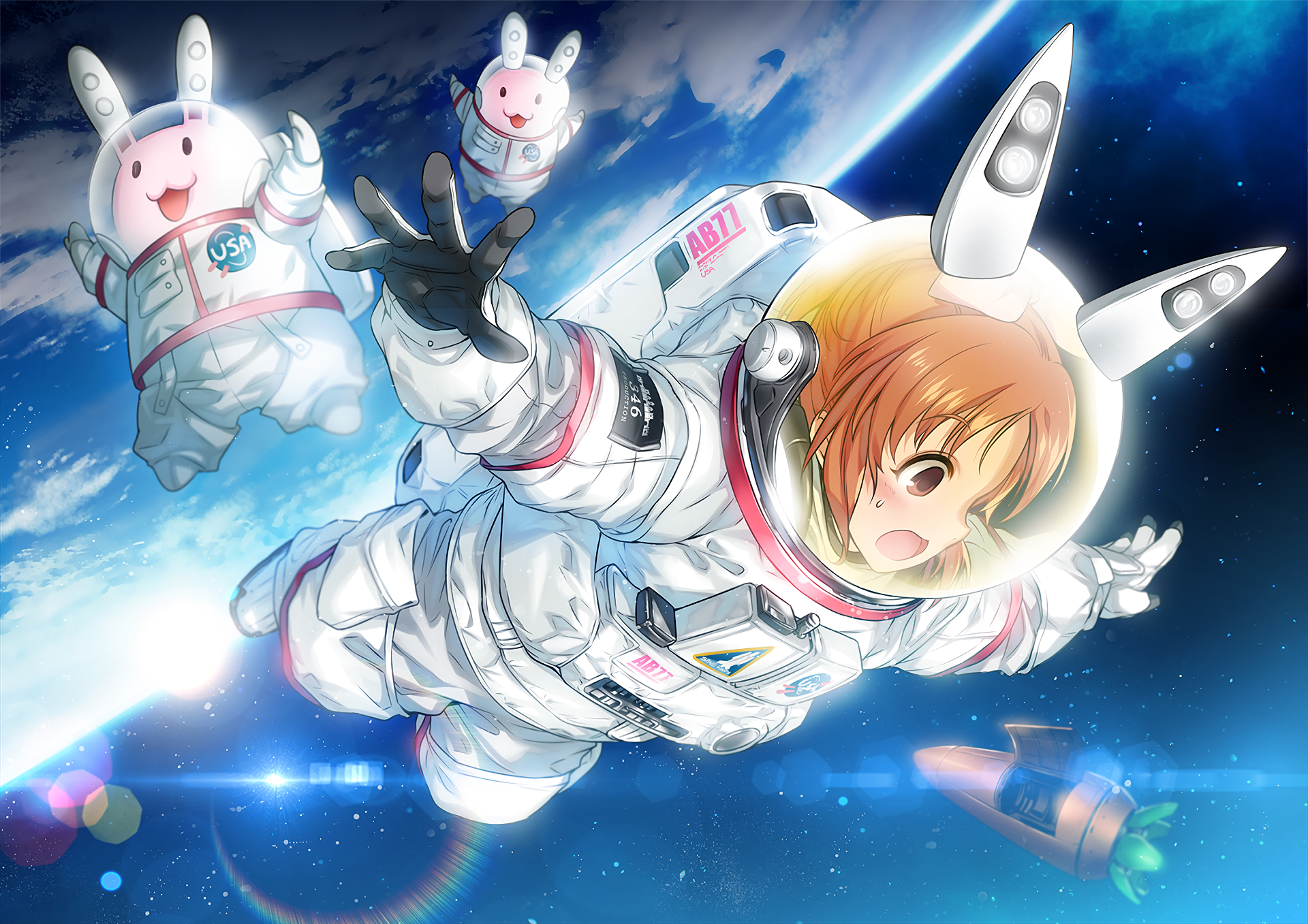 Description: A man in a space suit floating in the air with two rabbits on his back and a rocket in the background.