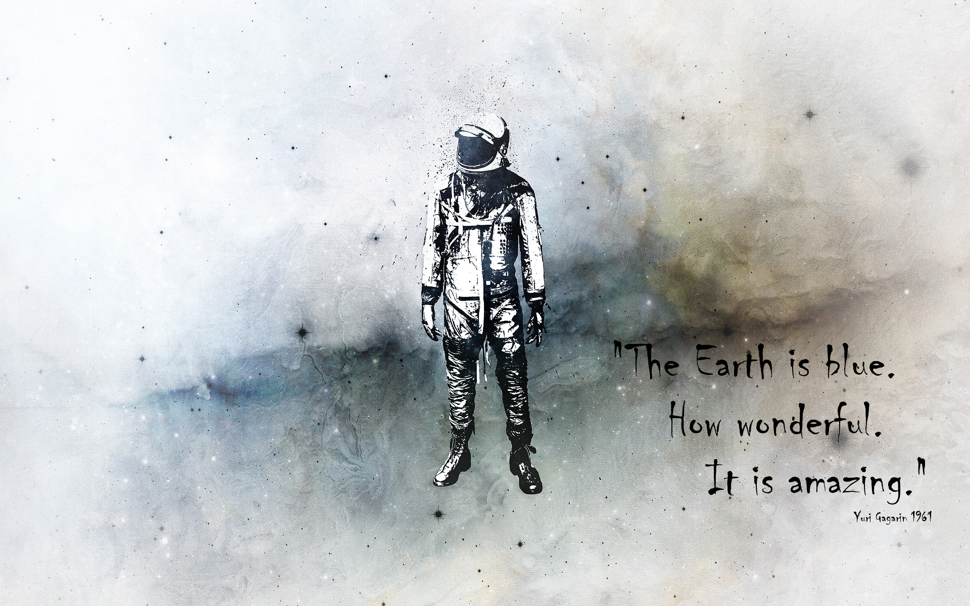 Description: A drawing of a man in a space suit with a quote on it that says.