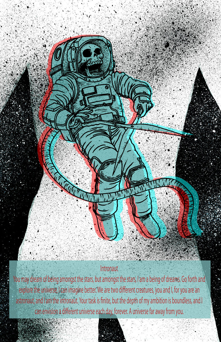Description: A drawing of a man in a space suit with a spear in his hand and a caption about the man.