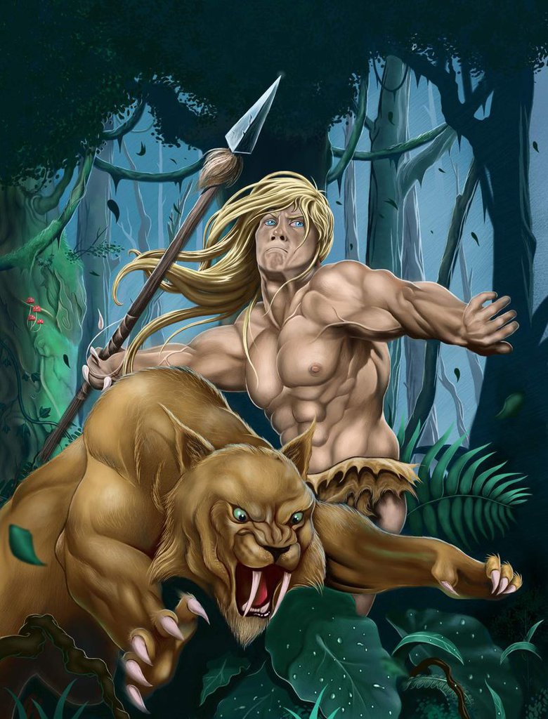 Description: A man with a spear and a lion in the woods with a spear in his hand and a lion in his other hand.