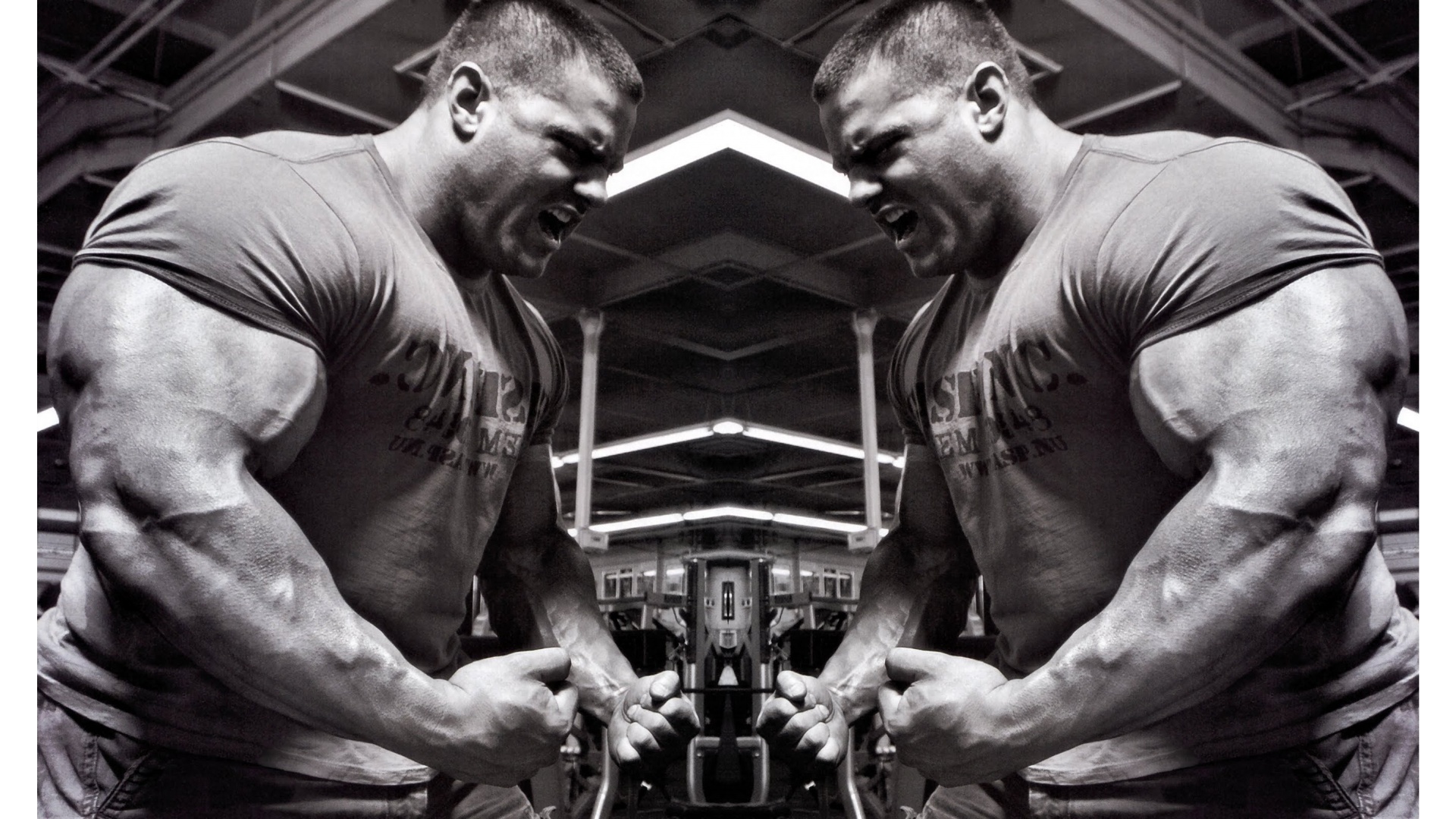 Description: A man is doing a squat with a barbell in a gym area with mirrors in the background and a reflection of him.