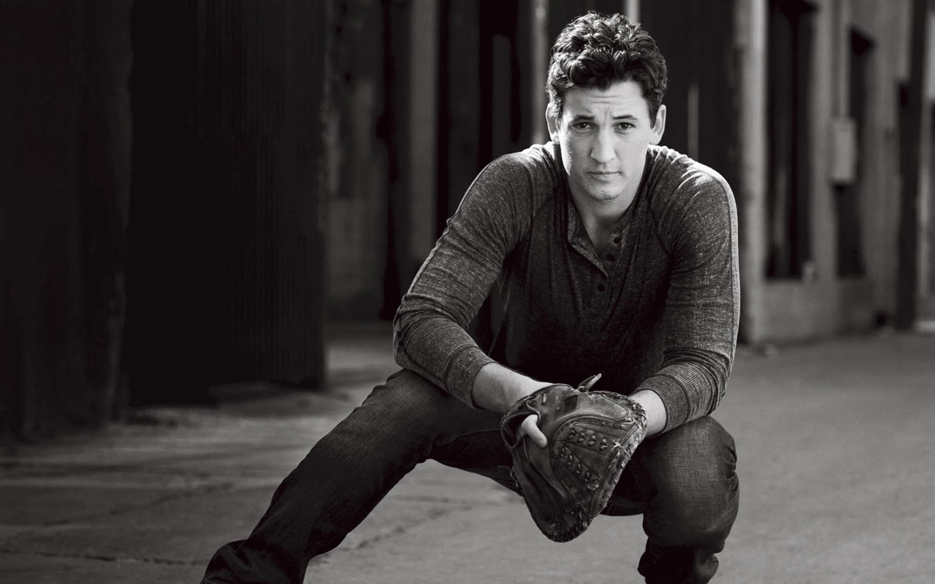 Description: A man squatting down with a baseball glove on his hand and a ball in his hand.