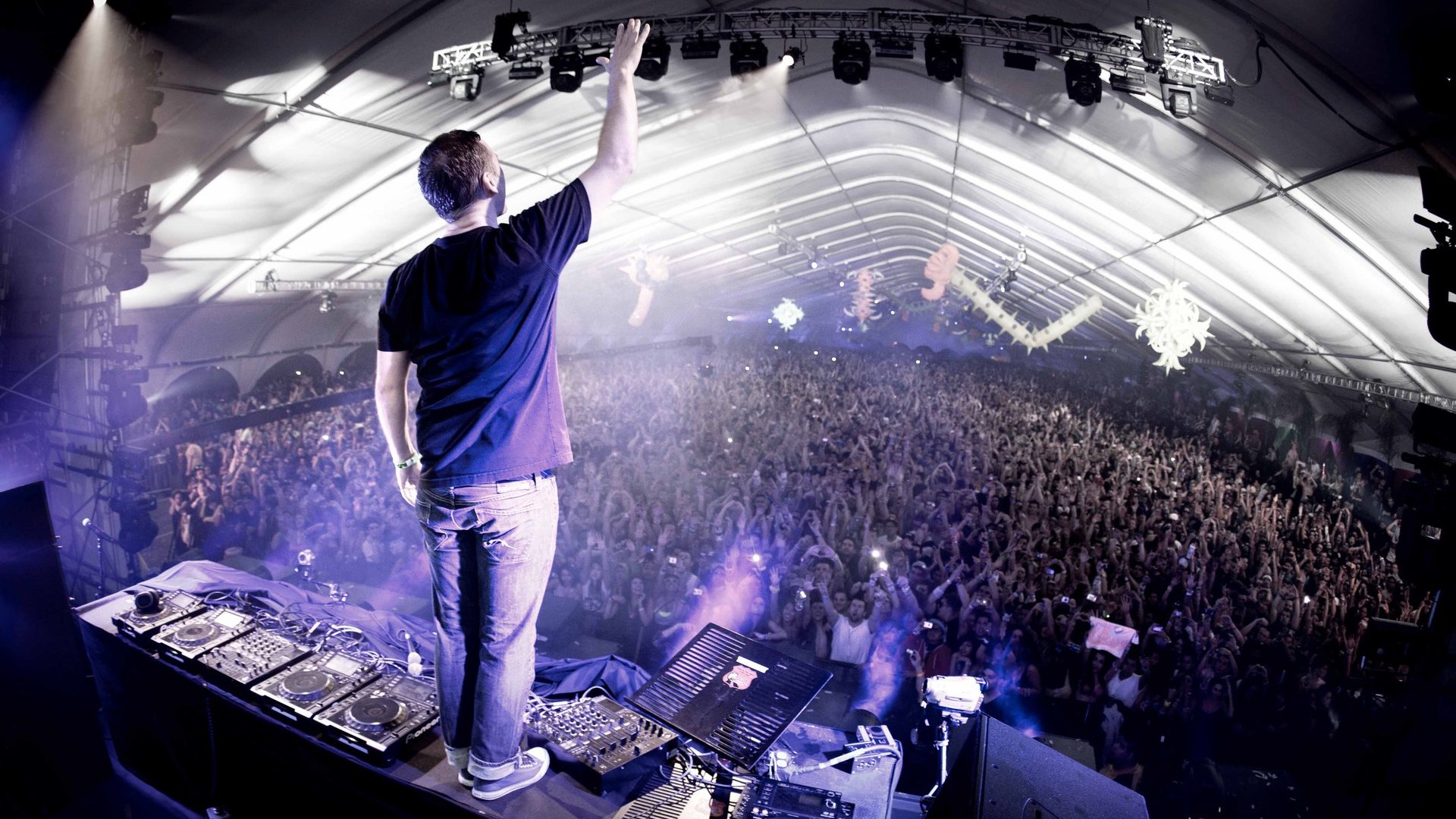 Description: A man standing on top of a stage with a dj's mixer in front of a crowd of people.