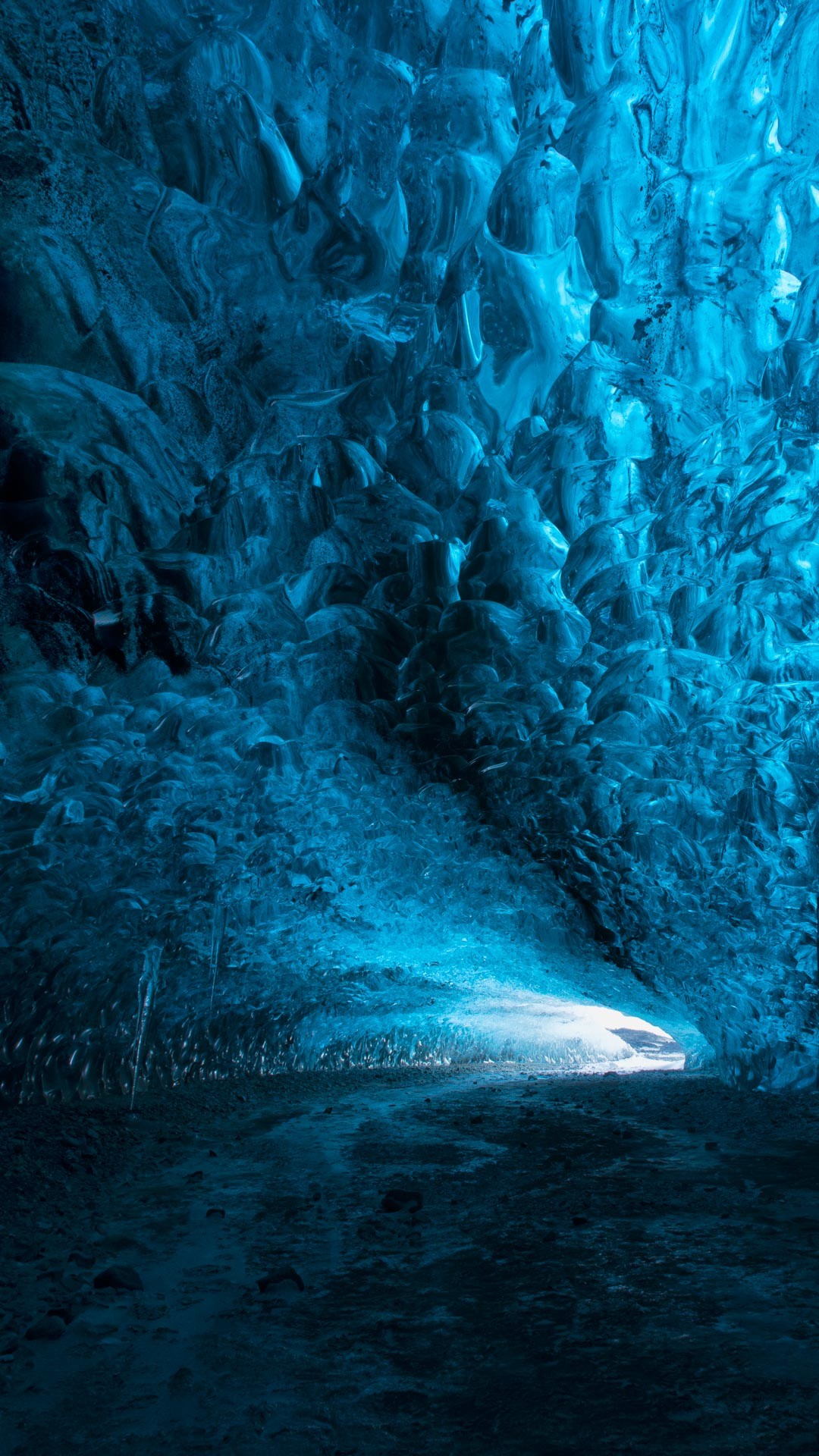 Description: A man standing in a cave with a light at the end of it and a blue ice cave behind him.