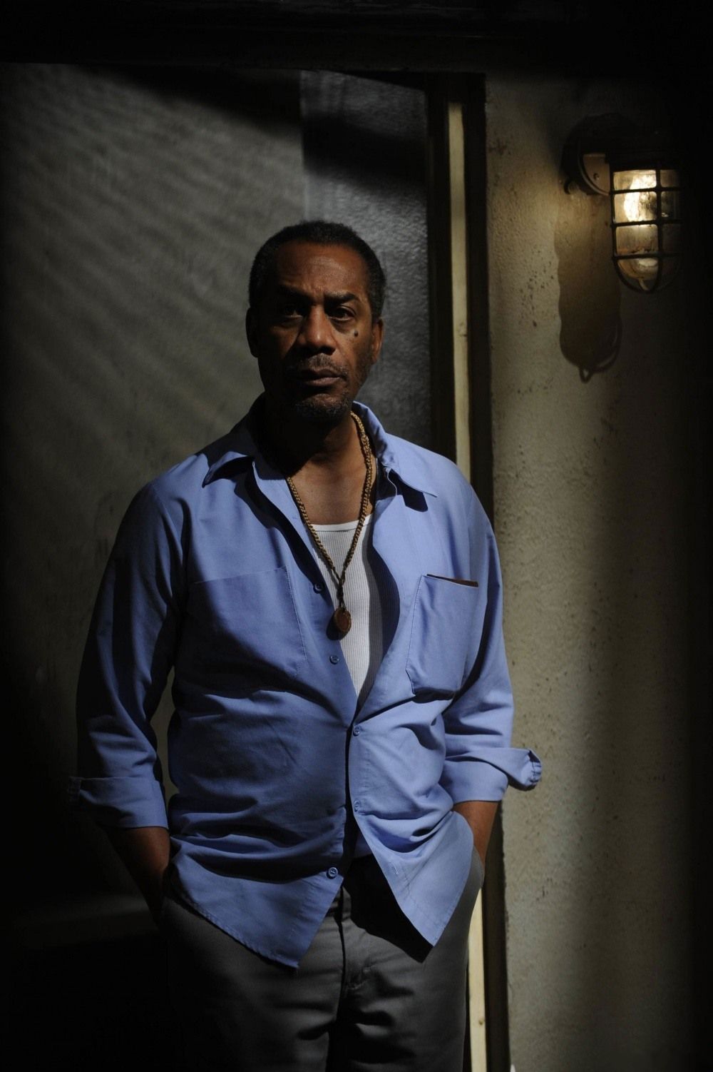 Description: A man standing in a doorway with his hands in his pockets and a necklace on his neck.