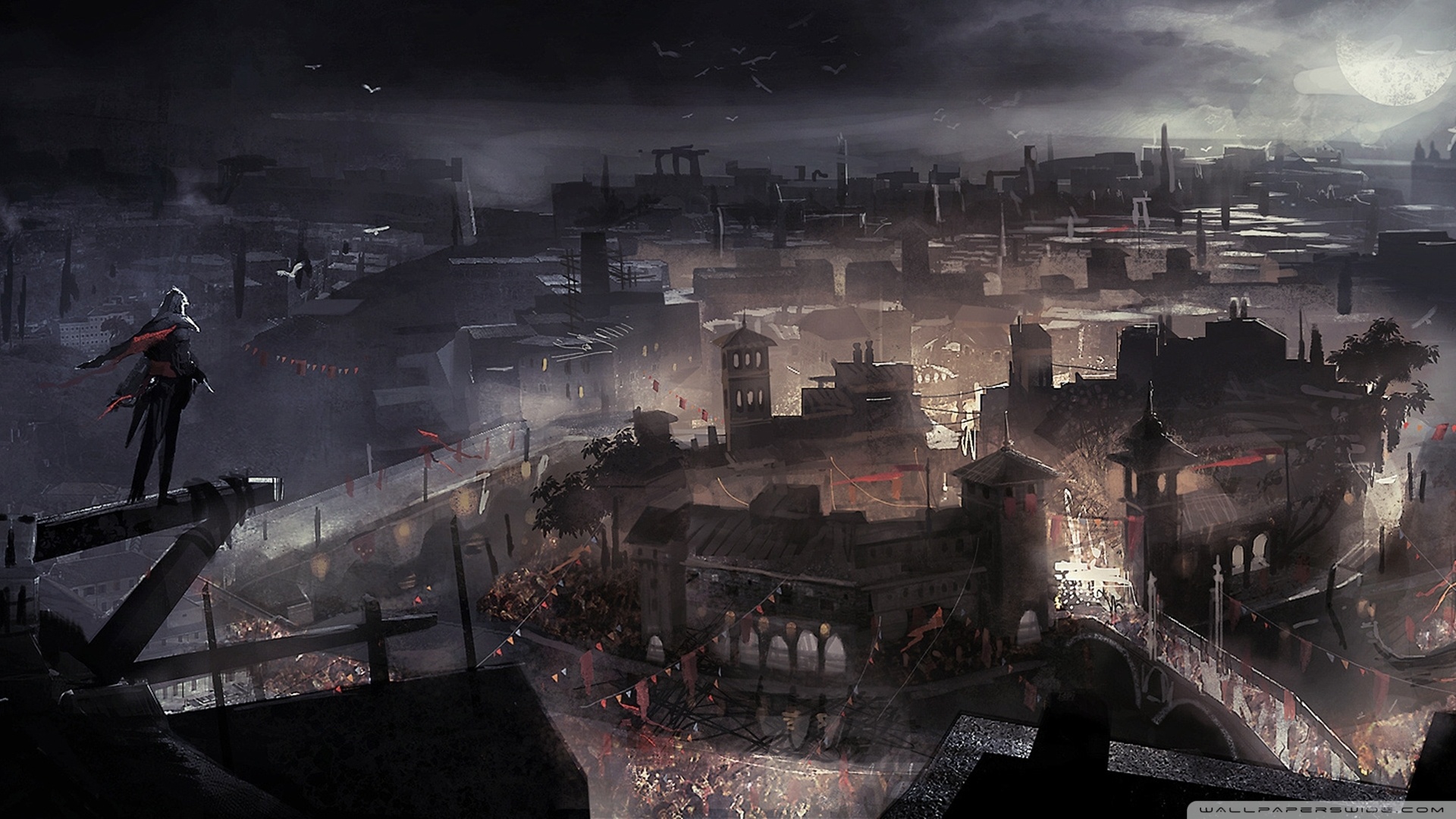 Description: A man standing on a ledge above a city at night with a full moon in the sky above him.