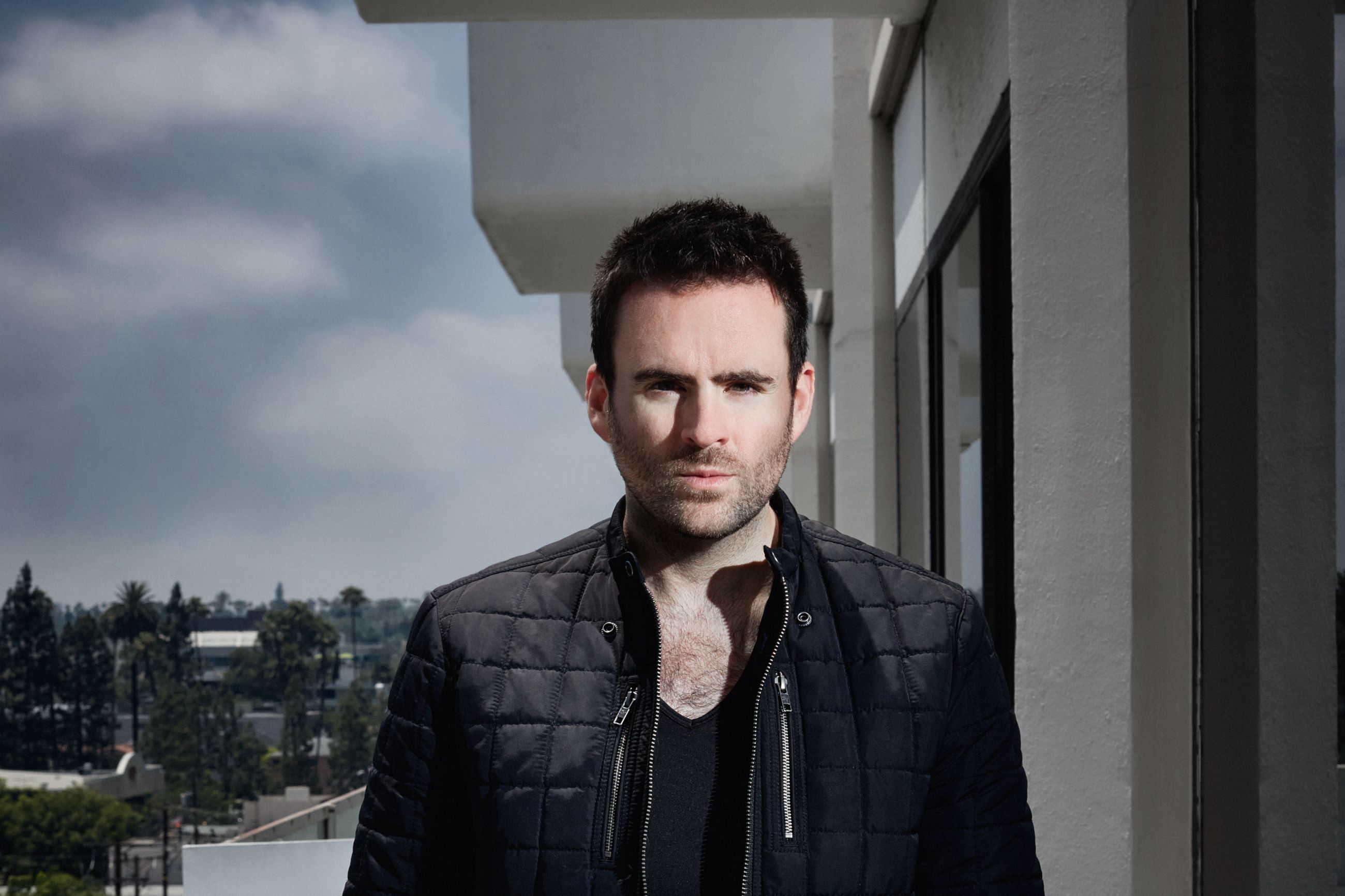 Description: A man standing outside of a building with a sky background and trees in the background.